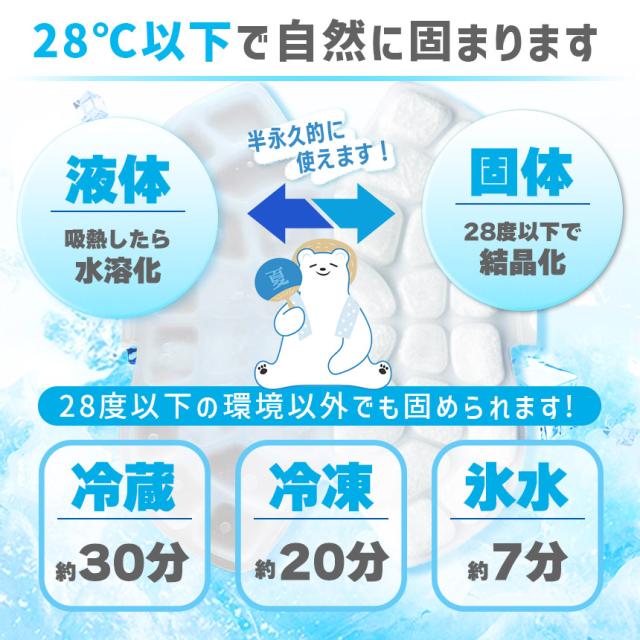 PCM素材で、人体に無害、無臭、半永久で使用でき結露もしない!しかも冷やさなくても28度以下で固まり、ヒンヤリ!ほてった熱を吸収!冷蔵庫や冷凍庫、冷水だと早く固まりつめた〜い♪