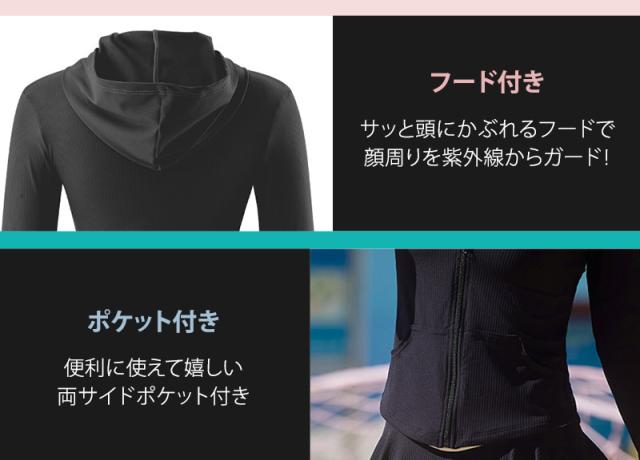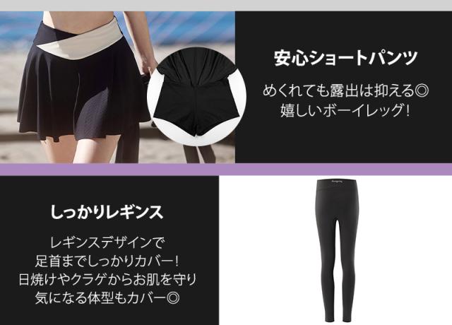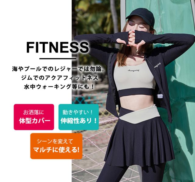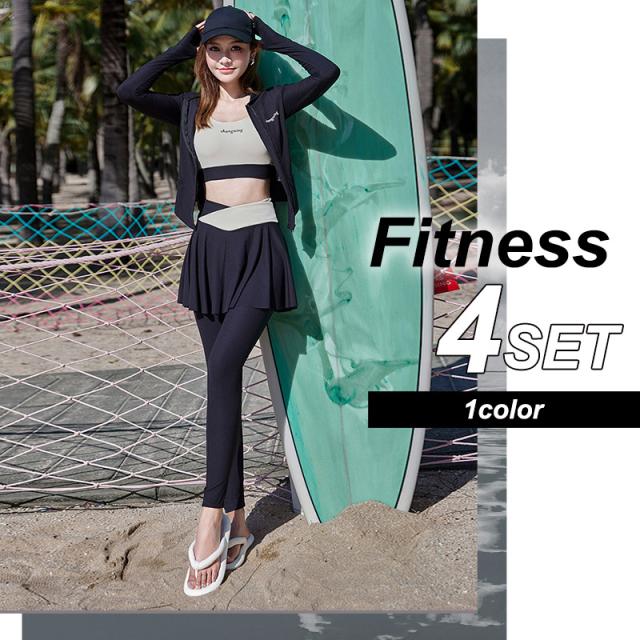 フィットネス 水着 レディース セパレート 大きいサイズ 体型カバー 長袖 4点セット フード付 ポケット ラッシュガード 前開き レギンス ブラ パンツ一体型スカート リブ ロゴ ノンワイヤー 二の腕 ウエスト ヒップ 太もも 脚 カバーアップ 黒