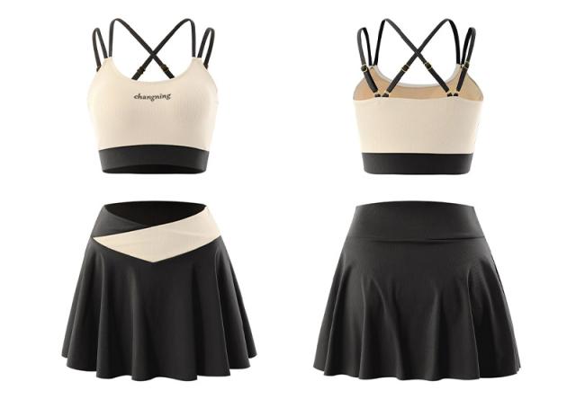 セット内容:4点セット(ブラ・パンツ一体型スカート・トップス・レギンス)