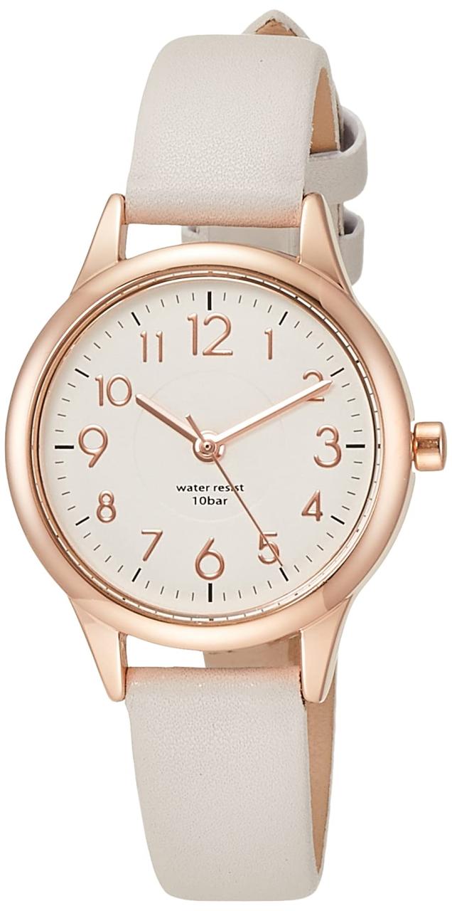 ●直径約28ミリの小ぶりでシンプルな丸型ケースを使ったレディース向けの腕時計 ●手洗いや洗い物などの水がかかっても使用できる防水仕様 ●ケースは、肌馴染みの良いピンクゴールドカラー ●インデックスにアラビア数字を使った、時刻の確認がしやすい文字盤デザイン。「分」を確認しやすい切分 (目盛り) 入り ●カジュアルなスタイルに合わせやすいグレーカラーの合皮ベルト。軽量で腕にも馴染みやすくサイズの調整も簡単。また、金属アレルギーのリスクも軽減 ●精度の高い日本製のクォーツムーブメントを使用