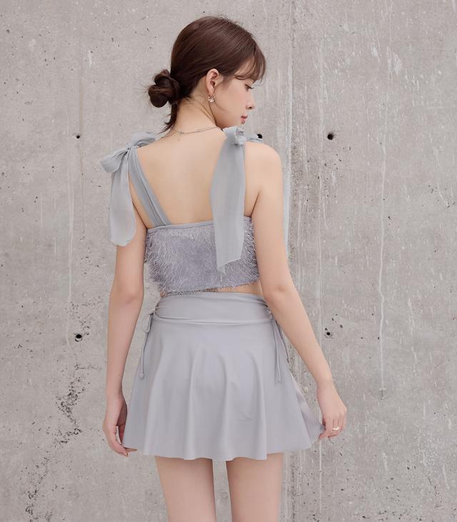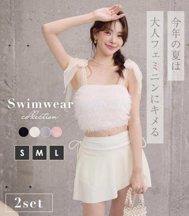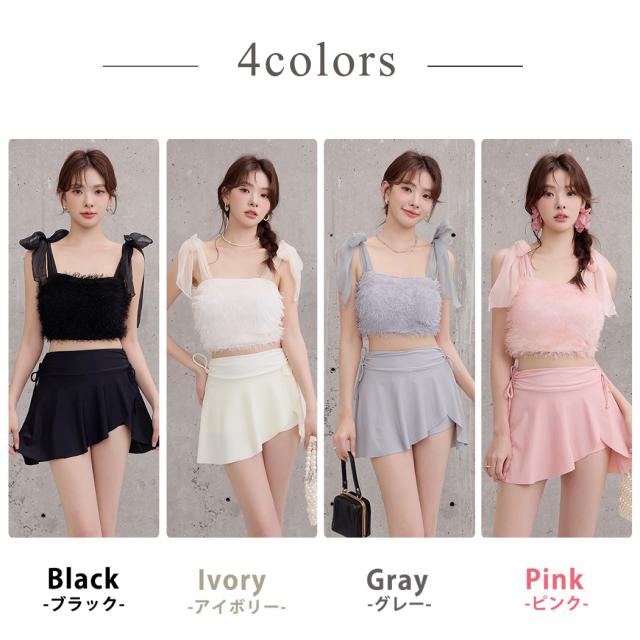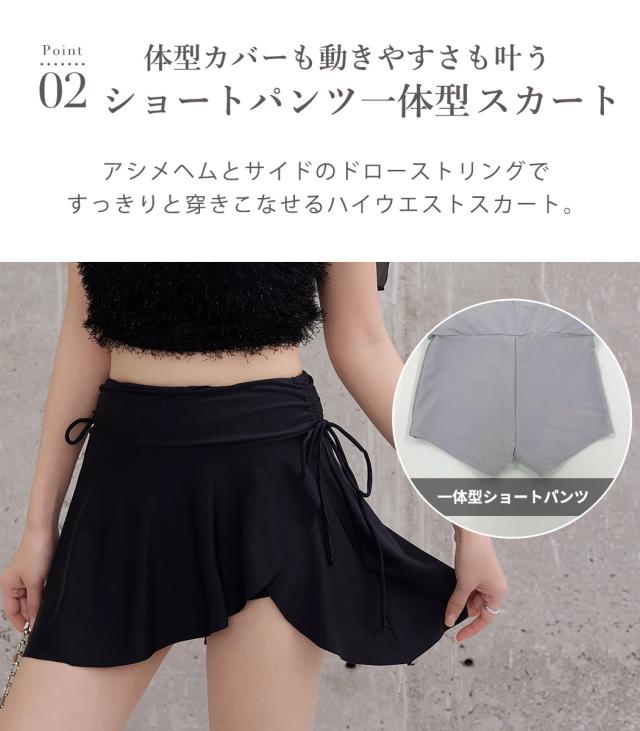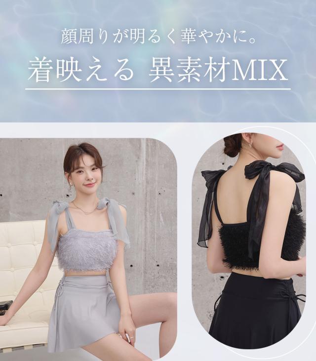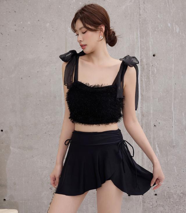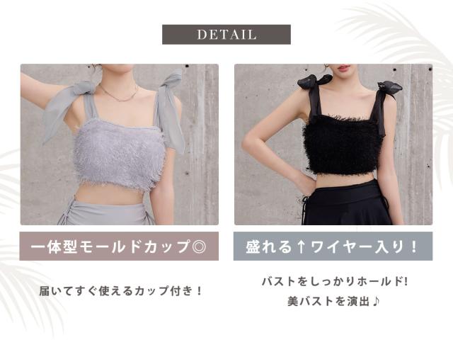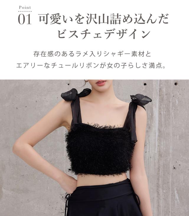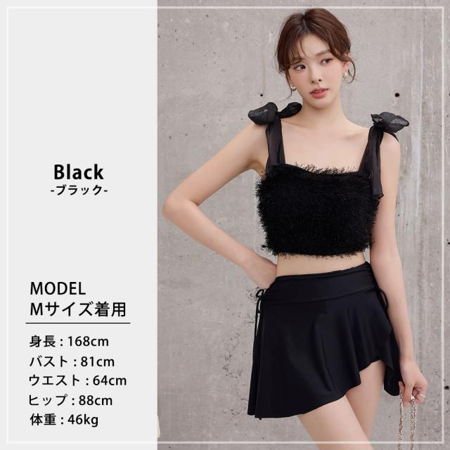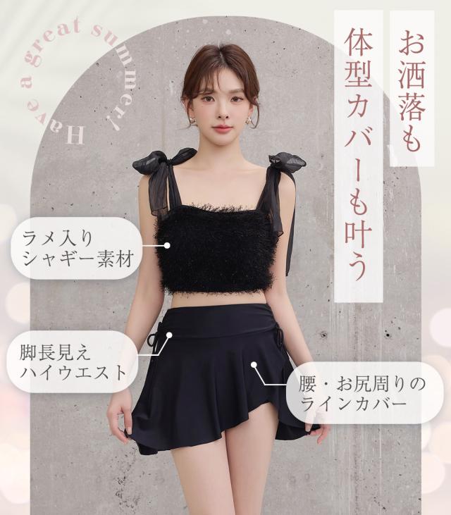 水着 レディース 体型カバー セパレート ビキニ ビスチェビキニ ハイウエスト 2点セット シャギー チュールリボン 異素材ミックス ワイヤー 一体型モールドカップ アシメヘム ドロスト ウエスト お尻 太もも カバーアップ ガーリー 無地 黒