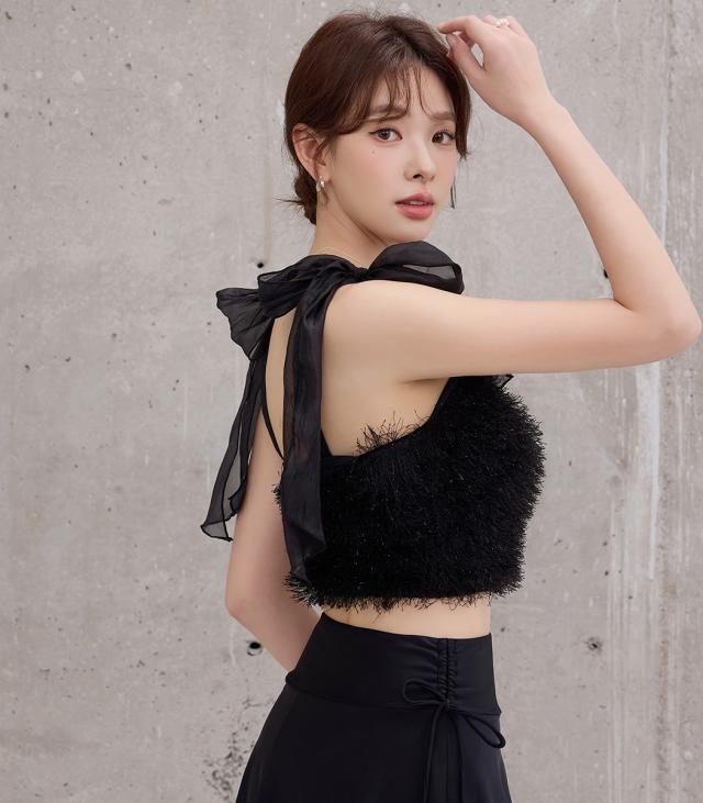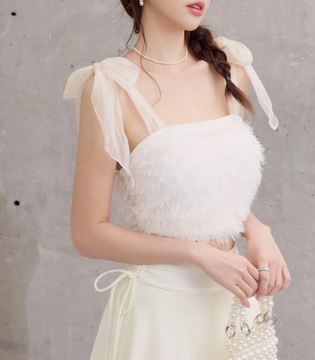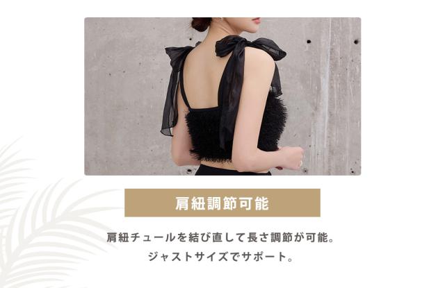 肩紐チュールを結び直して長さ調節が可能。