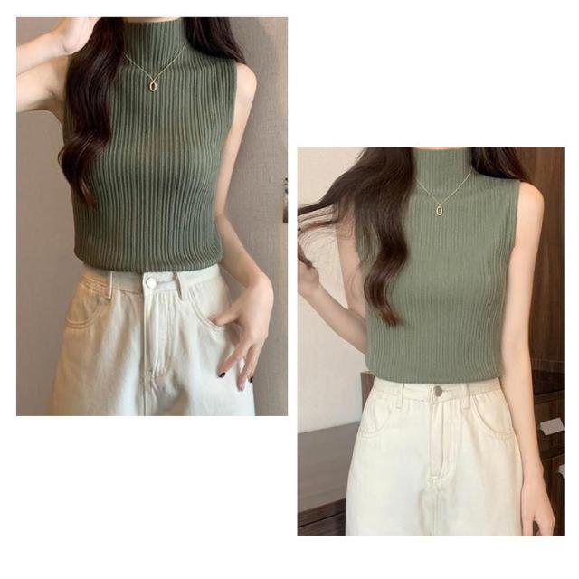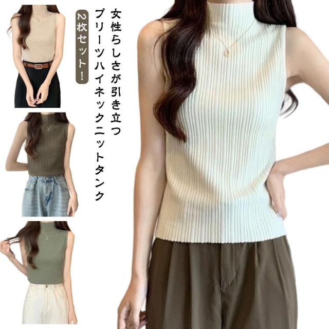 プリーツ タンクトップ レディース ハイネック ノースリーブ Tシャツ ニットトップス 2枚セット ストレッチ トップス ハイネックニット レイヤード シンプル 春 夏 サマーニット S M L XL 送料無料