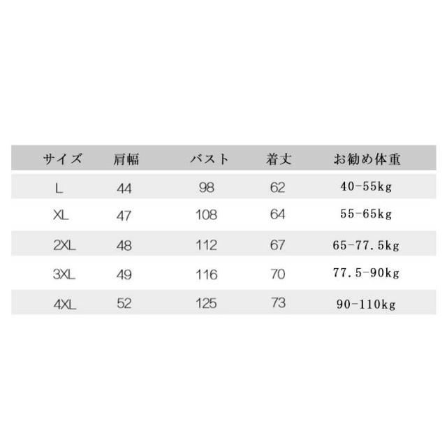 | サイズについての説明 | Lお勧め体重40-55kg XLお勧め体重55-65kg 2XLお勧め体重65-77.5kg 3XLお勧め体重77.5-90kg 4XLお勧め体重90-110kg ※サイズ表の実寸法は商品によって1-3cm程度の誤差がある場合がございます。 |