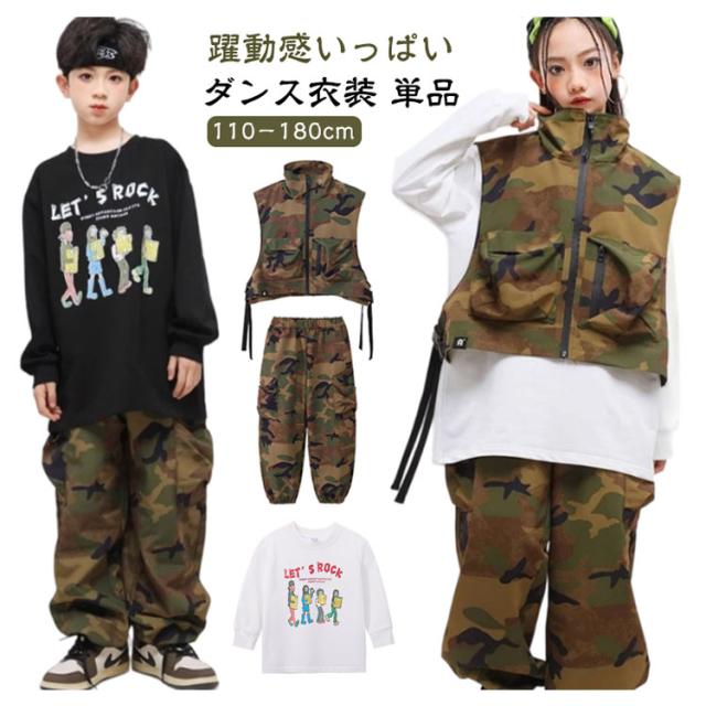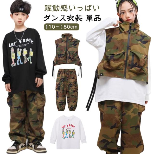 迷彩 おしゃれ キッズ ダンス衣装 単品 ショート ベスト ロングtシャツ 黒 白 おしゃれ 長袖 男の子 女の子 かっこいい ファション カジュアルシャツ トップス カーゴパンツ ジャズダンス ヒップホップ ポッピング 団体服 発表会 演出服 応援団 練習着