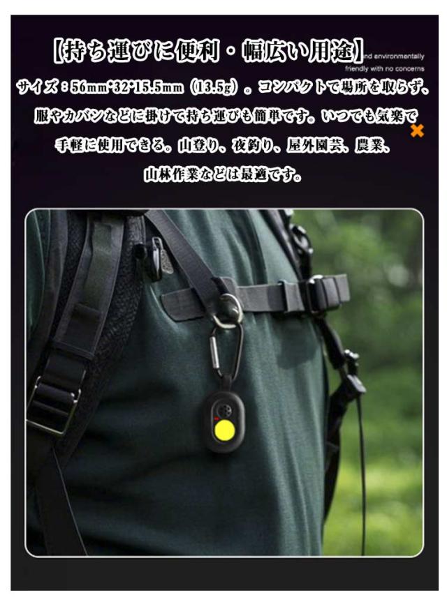 | 【強力な音波式 虫除け】 音波物理的な蚊忌避剤。マイコン音波周波数を採用し、360°全方向に音波、電磁波、バイオニック波を送信。蚊の聴覚系と神経系を邪魔して刺激し、蚊が嫌がる音をまねることで、蚊を効果的に追い払います。有効範囲は5〜15平方メートルで、無毒、無放射線、化学物質不使用の安全で環境に優しい蚊除けです。 【7種類の周波数の超音波を発生】 蚊などの虫が嫌がる7種類の周波数の超音波を発生させることにより、虫の近寄りを軽減します。 【充電式虫よけ器、IPX4防水】 超音波蚊よけ、は大人と子供が外で遊ぶのにとても適しています。付きのUSBケーブルで充電できます、いつでもどこでも使えます、フル充電で6日使用可能。IPX4防水レベルで、屋内や、アウトドア、キャンプ、登山、ハイキング、ジョギング、公園等様々なシーンで活躍!※防雨型でございますが完全防水ではございませんので、水に浸水させることはお控え下さい。 【物理害虫駆除】 薬剤を一切使用せず、超音波の力のみで害虫を撃退します。蚊、ダニ、ネズミ、ゴキブリ、アリ、ノミ、クモなど、さまざまな害虫に対応可能。お子様やペットのいるご家庭でも安心してお使いいただけます。人体や環境への影響がなく、室内外問わず活躍します。 【持ち運びに便利・幅広い用途】 サイズ:56mm*32*15.5mm(13.5g)。コンパクトで場所を取らず、服やカバンなどに掛けて持ち運びも簡単です。いつでも気楽で手軽に使用できる。山登り、夜釣り、屋外園芸、農業、山林作業などは最適です。 | |