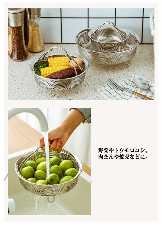 | ・お鍋に乗せるだけで蒸し器に変身 ・炊飯器の上に乗せるだけで気軽に蒸し料理 ・大きな専用蒸し器をわざわざ準備しなくても、手軽に蒸し料理が作れます。 ・油を使わず調理できるのでヘルシー ・野菜やトウモロコシ、肉まんや焼売などに。 | |