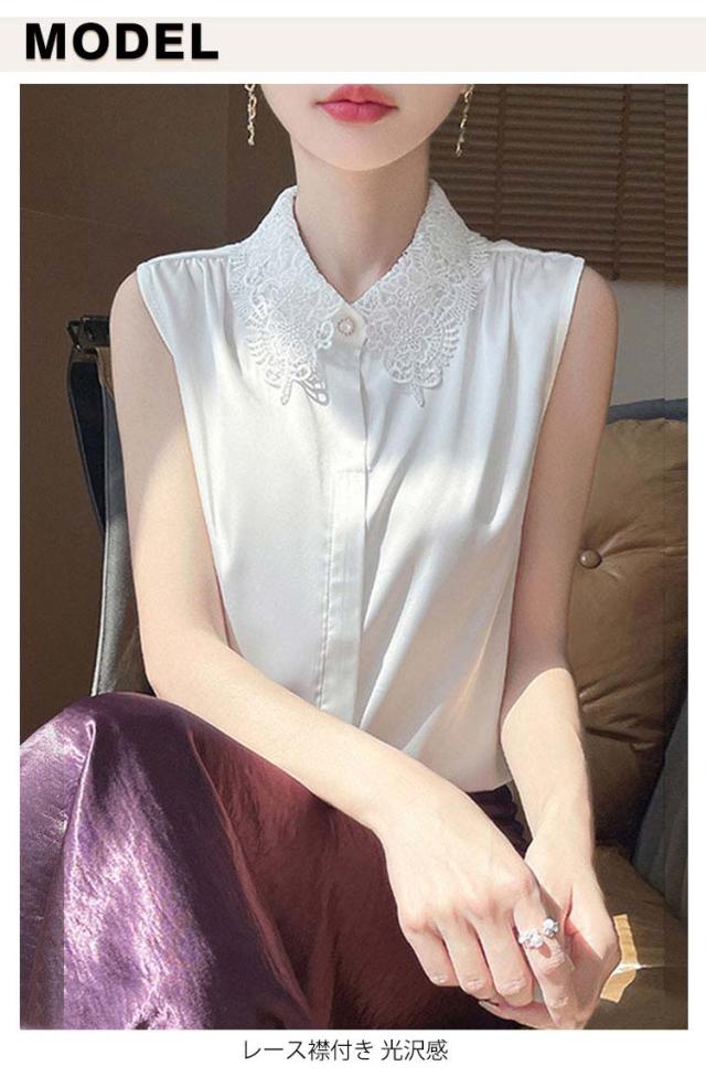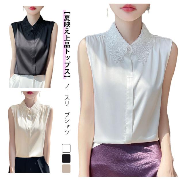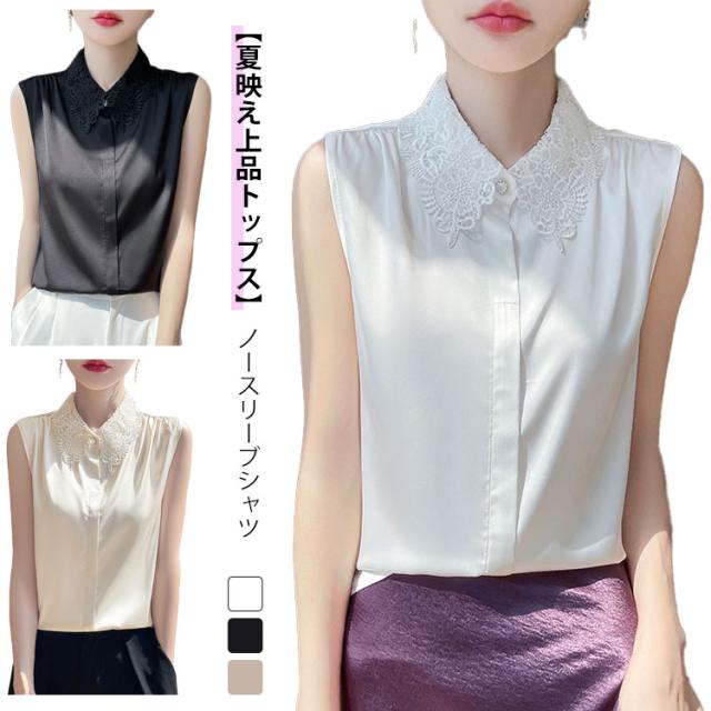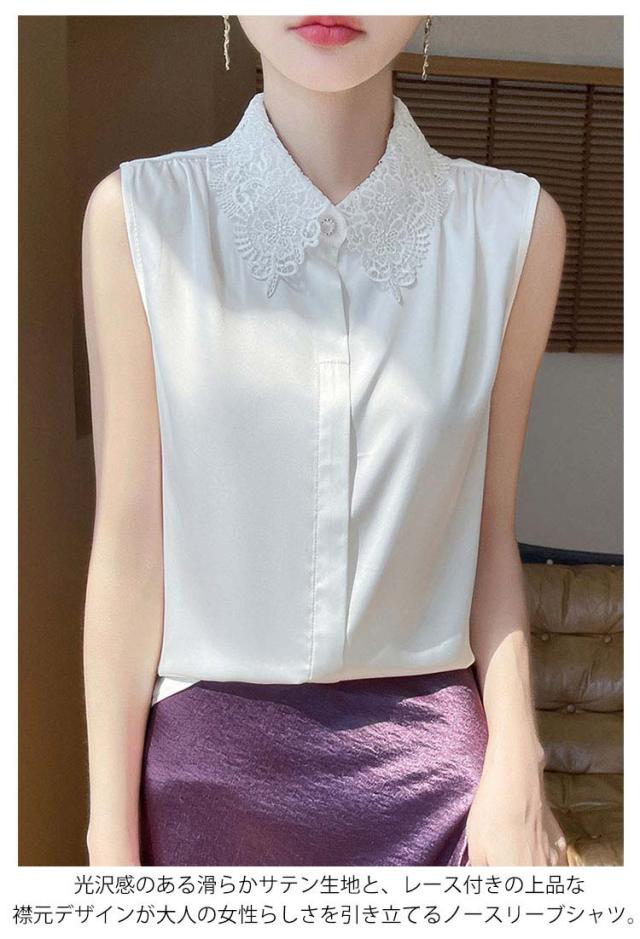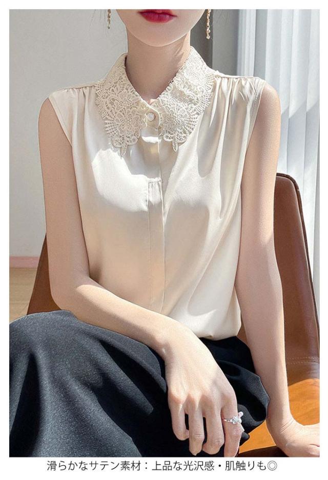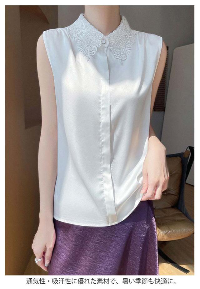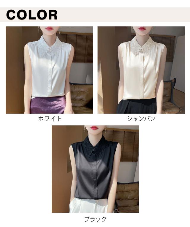 シャツ ノースリーブ レディース サテン シャツブラウス タンクトップ 光沢感 レース襟付き 前開き 大きいサイズ 涼しい 通気性 着回し 無地 シンプル きれいめ OL 通勤 夏服 ホワイト シャンパン ブラック