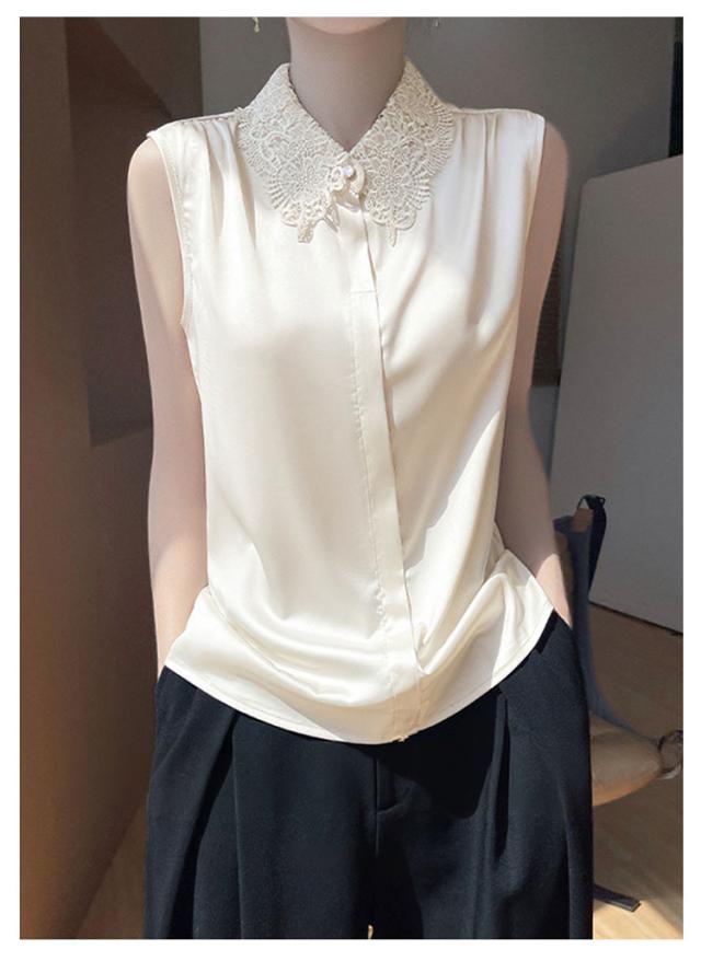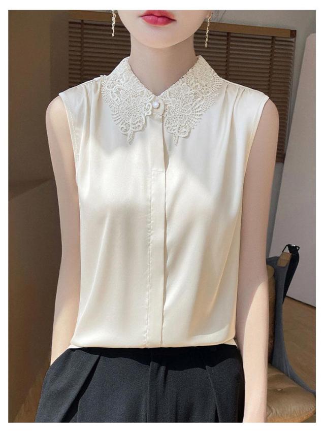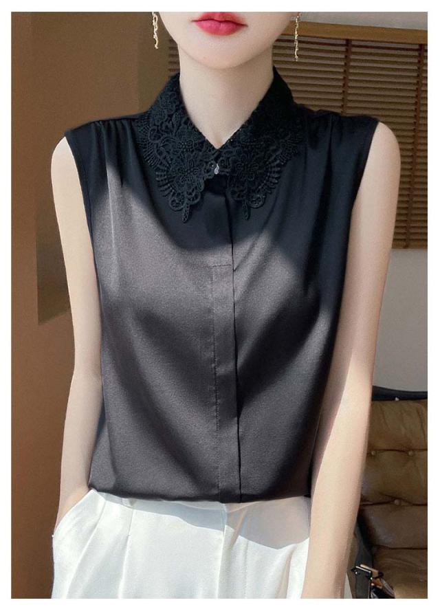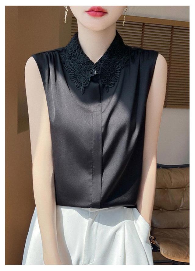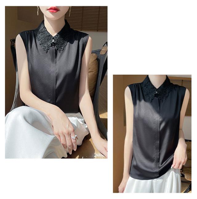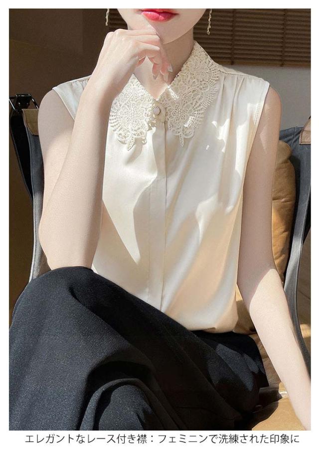 シャツ ノースリーブ レディース サテン シャツブラウス タンクトップ 光沢感 レース襟付き 前開き 大きいサイズ 涼しい 通気性 着回し 無地 シンプル きれいめ OL 通勤 夏服 ホワイト シャンパン ブラック