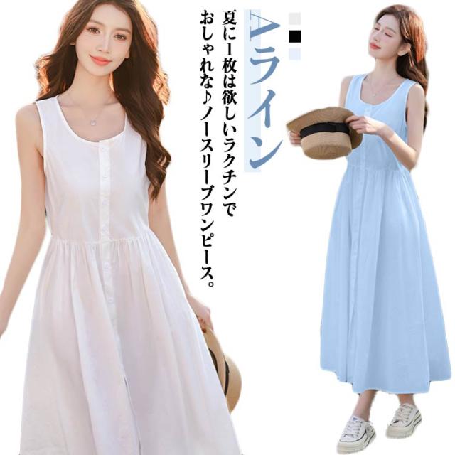 前開き Aライン マキシワンピース クルーネック 送料無料 タンクトップワンピース レディース 夏 マキシ丈 ロングワンピ ボタン付き タンクワンピース フレア ノースリーブ ゆったり 普段着 デート お出かけ