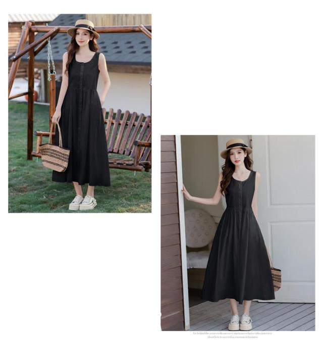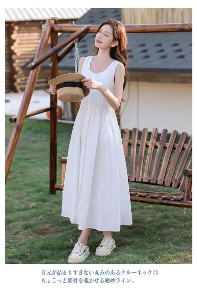 送料無料 Aライン タンクトップワンピース ボタン付き クルーネック マキシワンピース レディース 夏 マキシ丈 前開き ロングワンピ タンクワンピース フレア ゆったり 普段着 送料無料 デート お出かけ