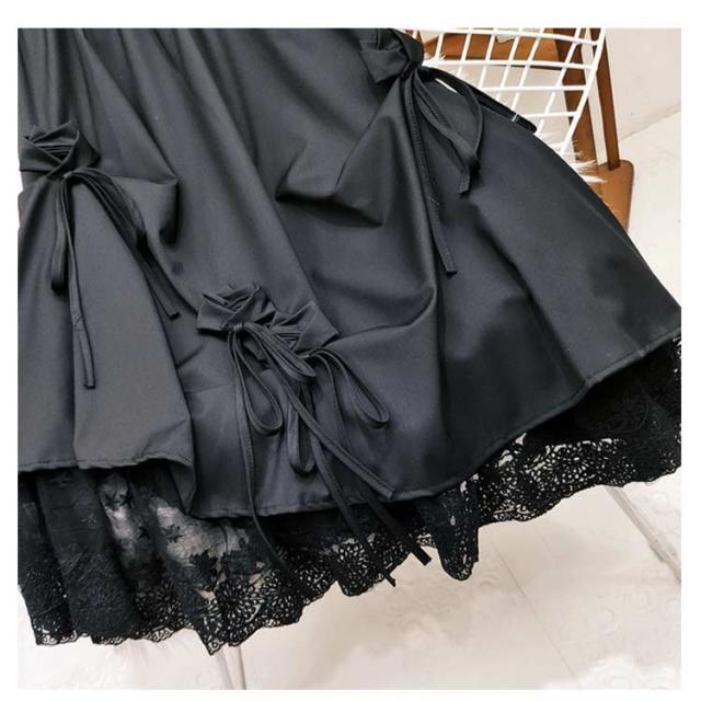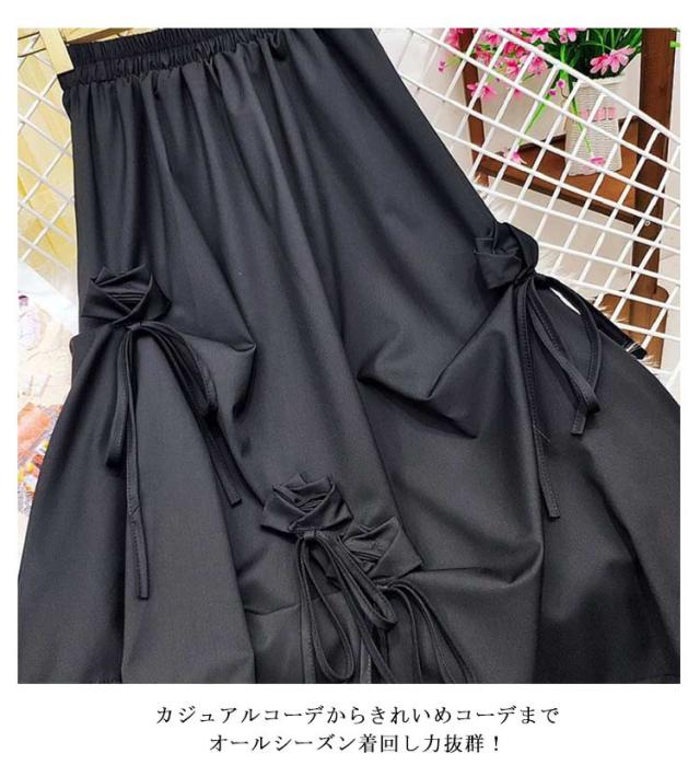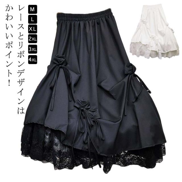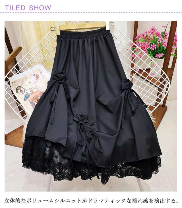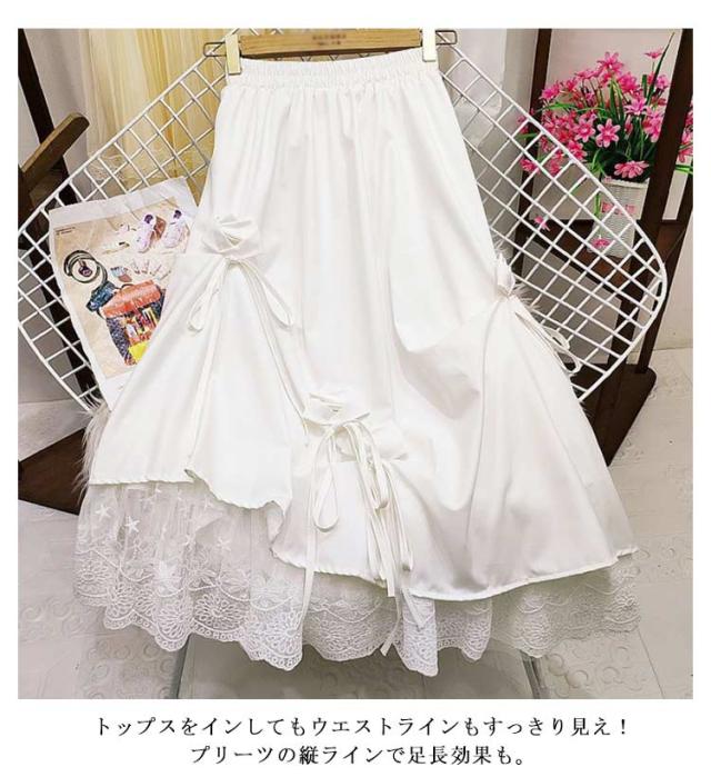 スカート リボン おしゃれ アシンメトリー ロング丈 カジュアル レース切り替え ロングスカート スカート ゆったり かわいい ボリューム感 原宿系 モード系 黒 白 ブラック ホワイト