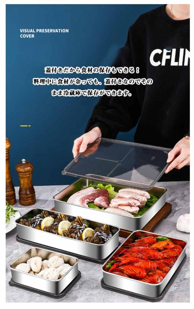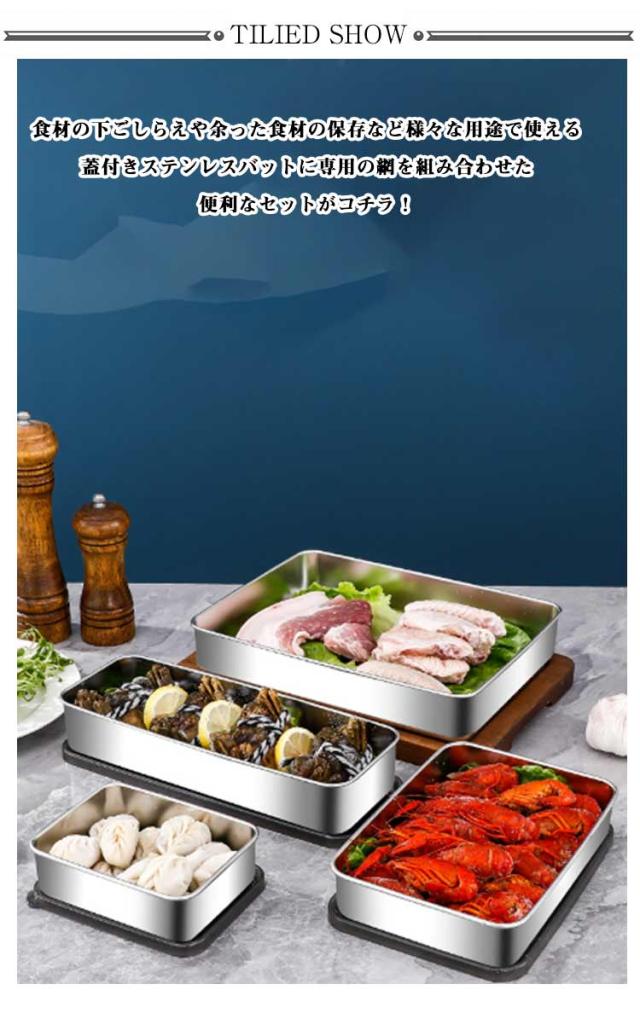 | 耐久性に優れたステンレスバットに保存に便利なフタ、専用のアミを組み合わせた便利なセット商品です!【3セット】【深型?Lサイズ】 食材の下ごしらえや余った食材の保存など様々な用途で使える蓋付きステンレスバットに専用の網を組み合わせた便利なセットがコチラ! 3つのバットセットで揚げ物料理がはかどる! バット3つをそれぞれ使って、食材の下ごしらえから油切りまで一括で行えるので、揚げ物料理に便利です! 蓋付きだから食材の保存もできる! 料理中に食材が余っても、蓋付きなのでそのまま冷蔵庫で保存ができます。 積み重ねてコンパクトに収納できるので、スペースをスッキリ使えます! バットは下味の漬け込み、食材の保存はもちろんのことオーブン用のケーキ型や寒天・ゼリーなどの冷菓子の型としても使用できます! またアミ付きなのでアサリの砂抜きやお豆腐の水切りなどもできます! 使わないときは重ねてコンパクトに収納! 角型なので余分なスペースを取らず、省スペースで収納可能です。 | |