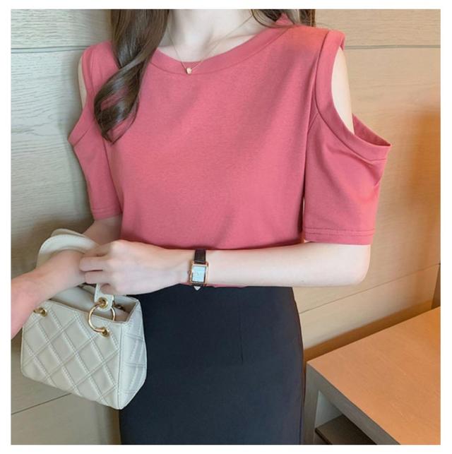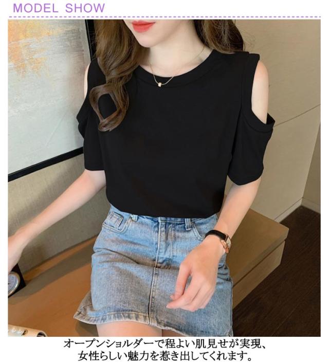 ゆったり オフショル 半袖Tシャツ レディース 肌見せ 半袖Tシャツ 無地 半袖 肩出し 肩あき Tシャツ トップス カットソー ビッグシルエット クルーネック オフショルダー お洒落 キレイめ