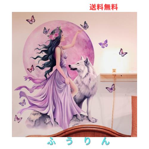 ?デザイン: 美しい紫と青、ピンク 、グリーンのグラデーションドレスを着た後ろ姿の少女と、優美な後ろ姿の少女をモチーフにしたウォールステッカー, 紫色の花と蝶のデザイン, ピンクの雲, ,毎日の生活に魔法のような輝きを添える、素敵なインテリアアイテムです。