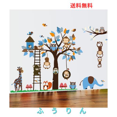 HOTIYOK ウォール ステッカー 森の動物たち おしゃれ ブルー ゾウ キツネ リス フクロウ サル キリン 木 diy 壁紙 壁 シール 剥がせる 男