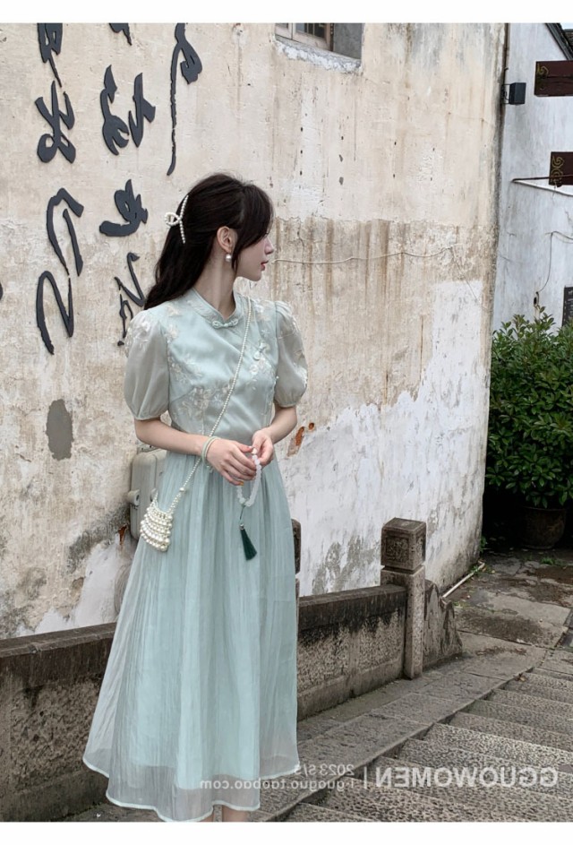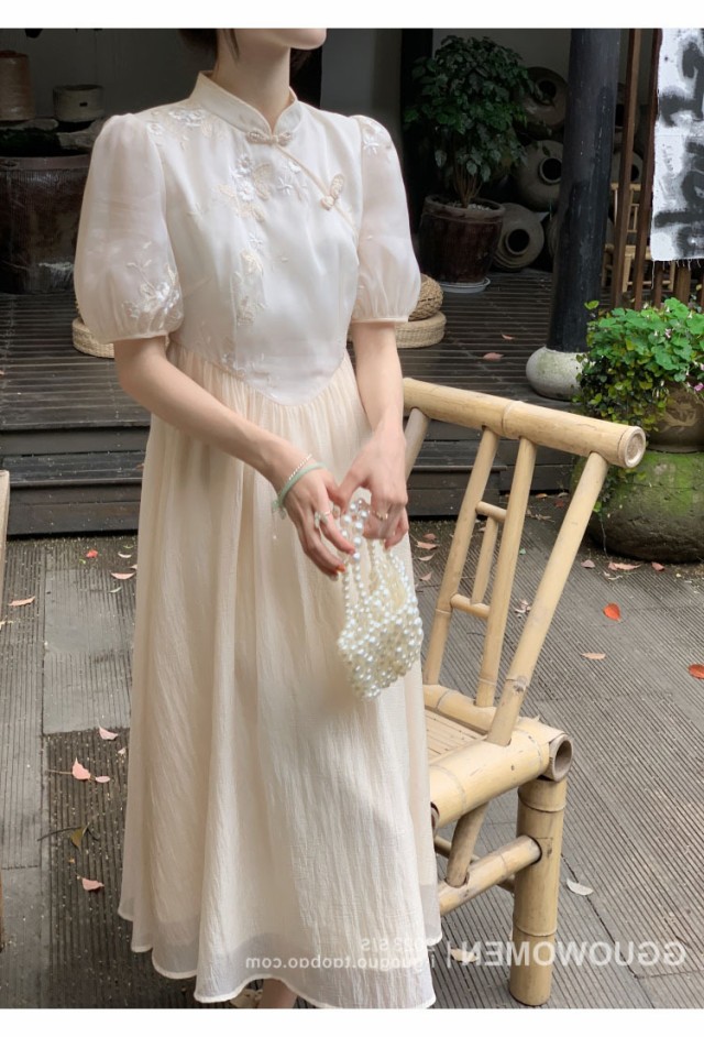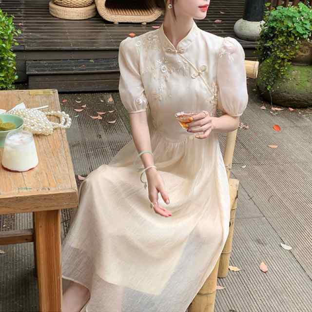 白ワンピース レディース 夏 チャイナ風 レトロ aライン シフォン スタンドカラー ロング丈 パフスリーブ 着?せ かわいい リゾート きれいめ おしゃれ カジュアル