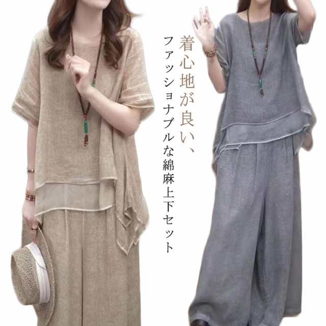 夏 カジュアルセットアップ 綿麻 セットアップ ワイドパンツ トップス 透气 レディース 夏服 薄手 柔らか 上下セット 春 半袖 ロングパンツ きれいめ カジュアル シンプル ゆったり ナチュラル 大きいサイズ シンプル おしゃれ 体型カバー 通勤 デート ママコーデ 無地 軽量