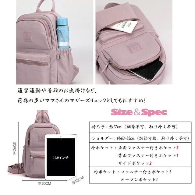 コンパクトサイズながらもポケットが多い上にマチ広なので見た目以上の収納力、通学通勤や普段のお出掛けなど、荷物の多いママさんのマザーズリュックとしてもおすすめ