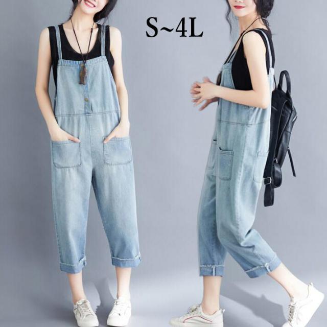 デニムサロペット サロペット オールインワンデニムパンツ サルエルパンツポケットボトムス9分丈 ロング デニムノースリーブ レディース大きいサイズ 春 夏 M L2L 3L