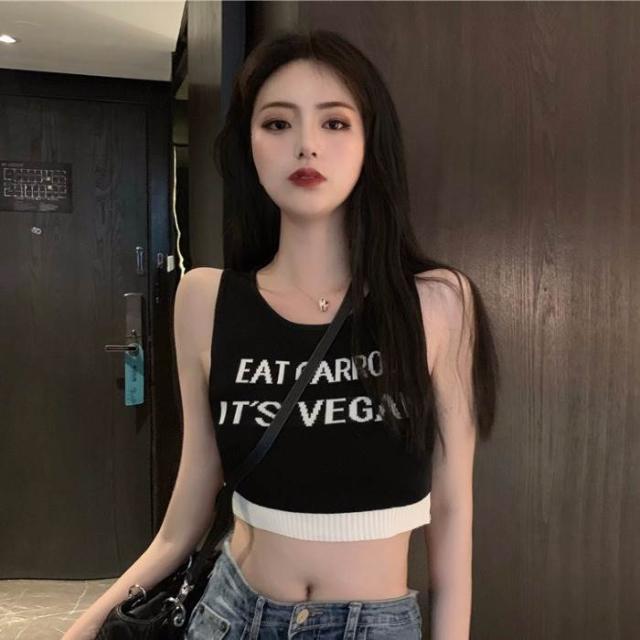 タンクトップ レディース ニット ノースリーブ 夏 ショート丈 ロゴ入り クルーネック へそ出し トップス 大人 女子 かわいい おしゃれ カジュアルコーデ 肌見せ キュート ガーリー