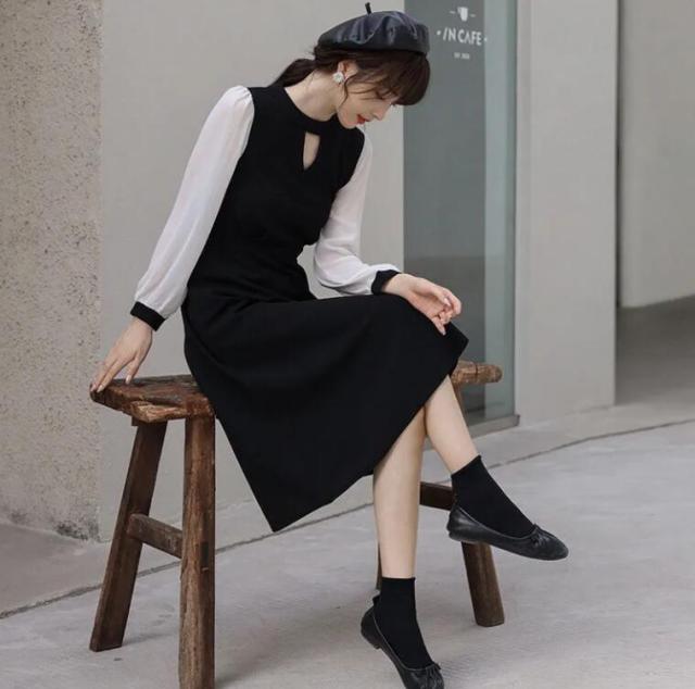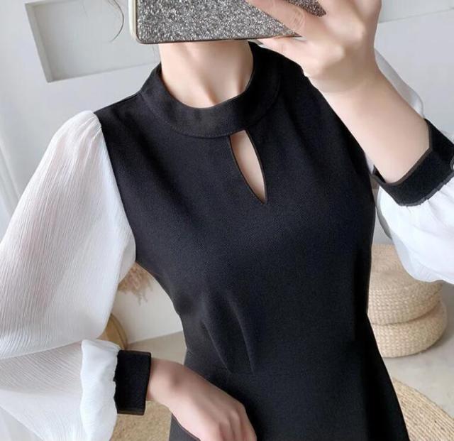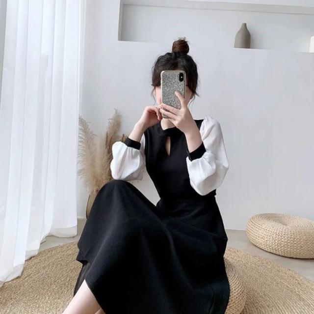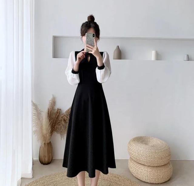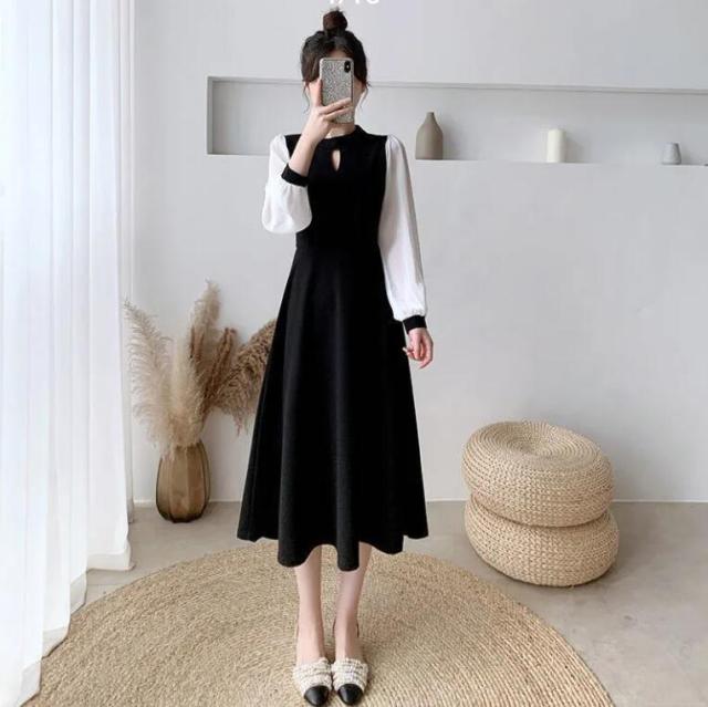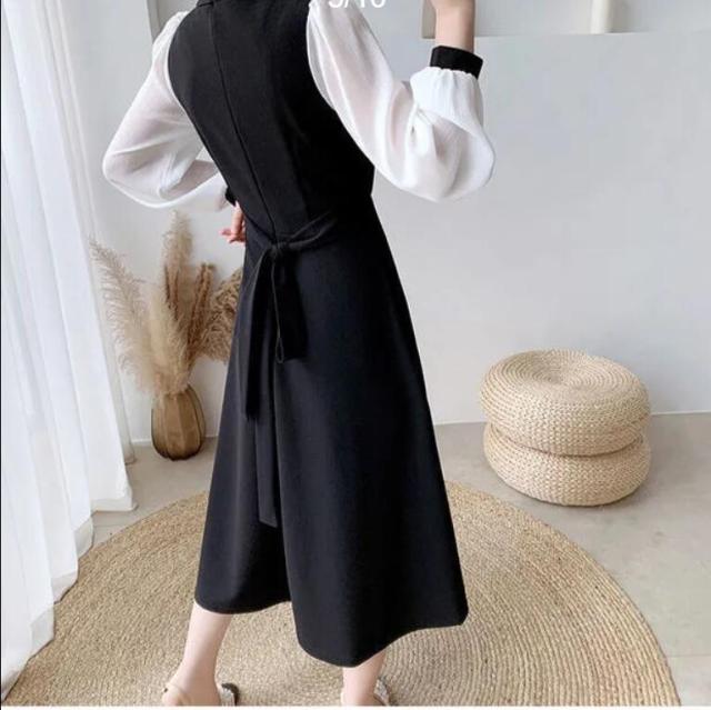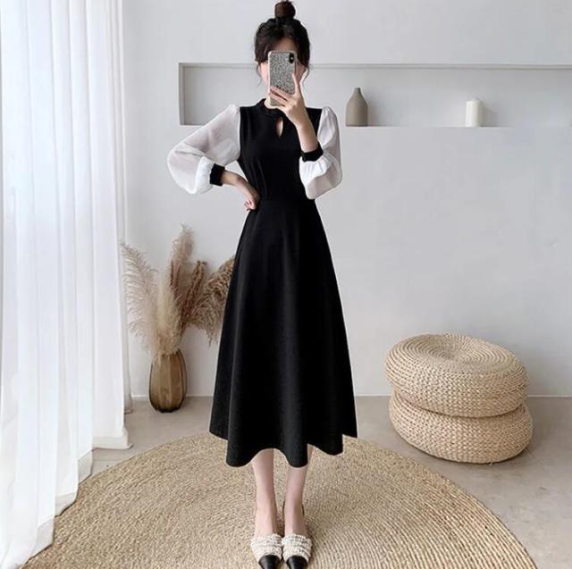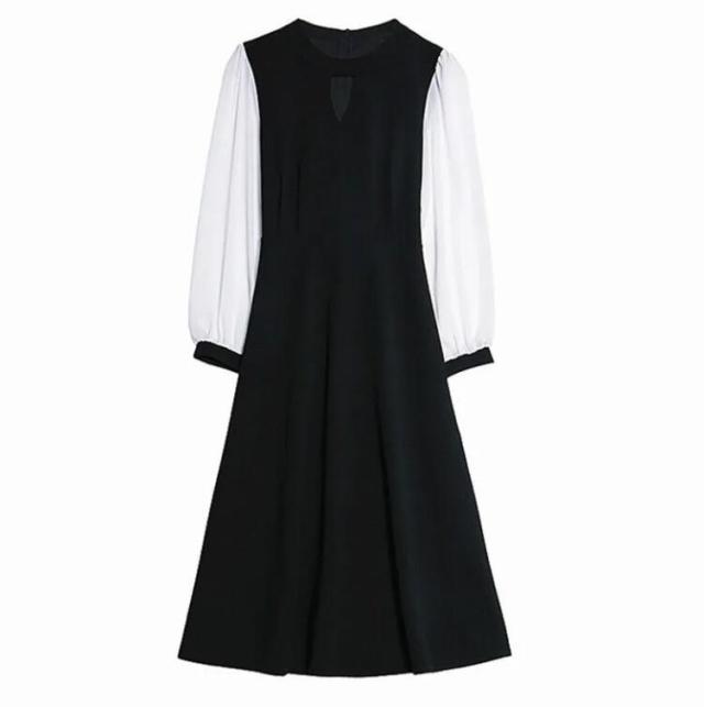 ワンピース レディース キーホールネック ロングワンピース ドッキング バイカラー ワンピース 切り替えワンピース 膝下 ロング ミモレ丈 Aライン フレア ワンピ 長袖 袖シフォン 大きいサイズ リ