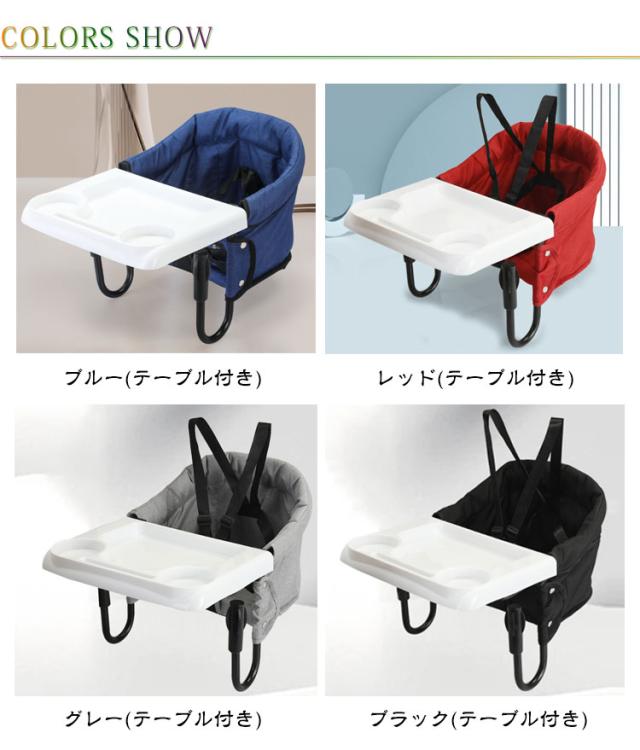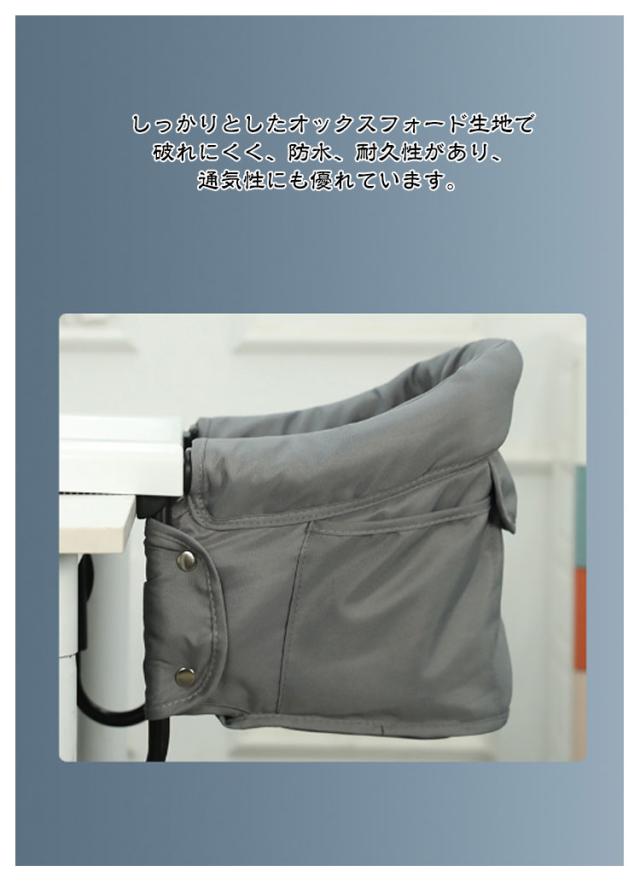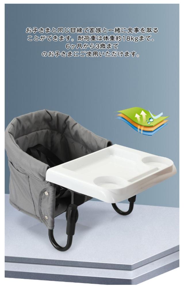 | テーブルに引っ掛けて使うできるベビーチェア。 お子さまと同じ目線で家族と一緒に食事を取ることができます。耐荷重は体重約18kgまで、6ヶ月から3歳までのお子さまにご使用いただけます。 調整可能な固定システムレバーで安定性が高く耐荷重も強いです。 5点式調整可能のシートベルトは赤ちゃんの腰や肩を固定することができる。食事中の立ち上がり、滑り落ちを防止。どの高さのテーブルにも対応します。 しっかりとしたオックスフォード生地で破れにくく、防水、耐久性があり、通気性にも優れています。 背部とサイド側にはポケットが付いていて、赤ちゃんの身の回り品を収納できます。 コンパクト収納可能でスペースを取らず、携帯しやすいです。 | |