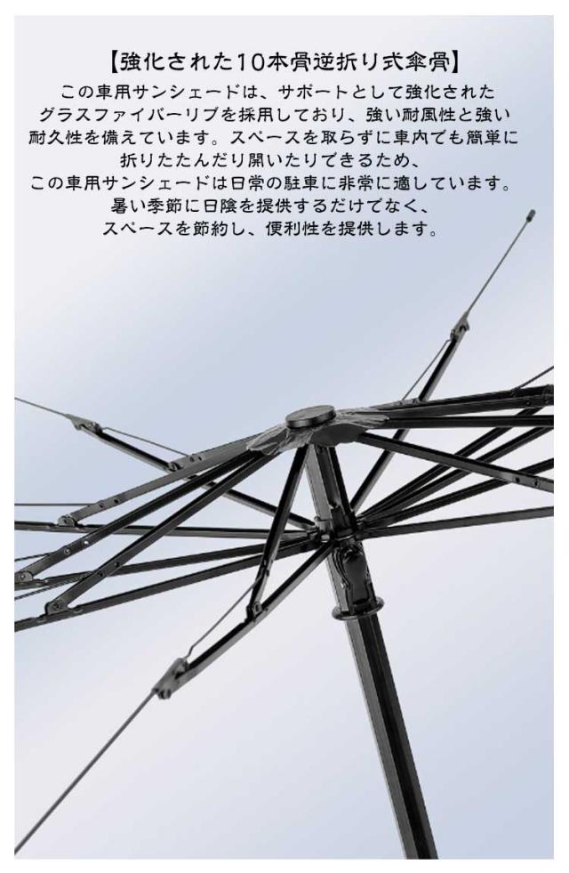 | 【日避けサンシェード】 夏場の運転では日避け対策のサンシェードが必須となります。優れたパラソルは、蒸し暑い真夏でも車を日光から守り、車内の快適な環境を保ちます。傘型サンシェードは高品質と実用性を兼ね備えた新しいタイプのカーアクセサリーです、これまで以上に涼しく感じるだけでなく、紫外線、高温などの危険から愛車を守ります。車用パラソルは断熱効果が優れているだけでなく、傘をさすだけで即利用できます。高品質の素材で作られた傘には強力な繊維で耐久性が優れます。 【強化された10本骨逆折り式傘骨】 この車用サンシェードは、サポートとして強化されたグラスファイバーリブを採用しており、強い耐風性と強い耐久性を備えています。スペースを取らずに車内でも簡単に折りたたんだり開いたりできるため、この車用サンシェードは日常の駐車に非常に適しています。暑い季節に日陰を提供するだけでなく、スペースを節約し、便利性を提供します。 【簡単取り付け】フロントガラス専用設計で、簡単に取り付けができ、ぴったりフィットします。面倒な取り付け作業はなく、ドライブ前にさっと取り付けられます。 【コンパクト&収納可能】使わない時にはコンパクトに折りたため、収納スペースを取らずに保管できます。車内に常備しておけば、急な日差しでも安心です。 | |