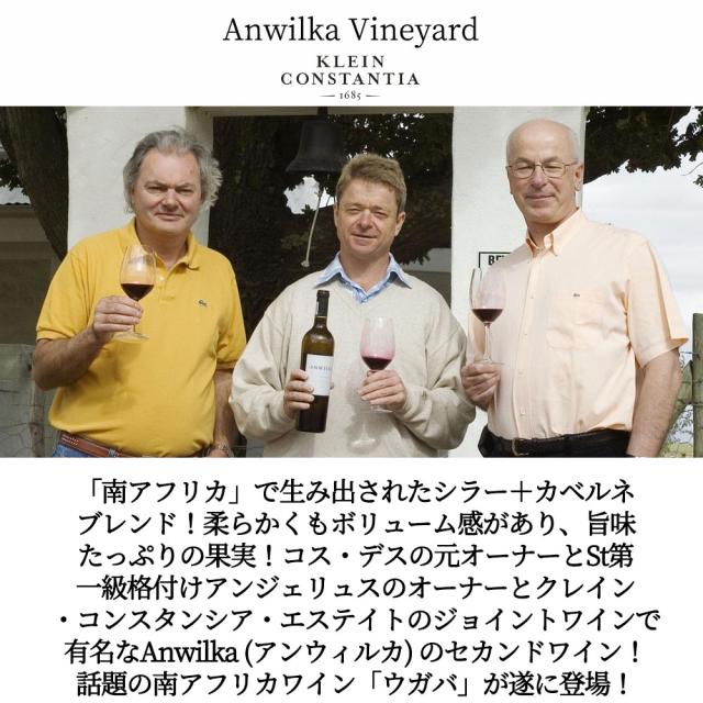 「南アフリカ」で生み出されたシラー+カベルネブレンド!柔らかくもボリューム感があり、旨味たっぷりの果実!コス・デスの元オーナーとSt第一級格付けアンジェリュスのオーナーとクレイン・コンスタンシア・エステイトのジョイントワインで有名なAnwilka (アンウィルカ) のセカンドワイン!話題の南アフリカワイン「ウガバ」が遂に登場!
