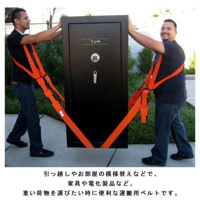 | 引っ越しやお部屋の模様替えなどで、家具や電化製品など、重い荷物を運びたい時に便利な運搬用ベルトです。 女性2人でも大きな家具を簡単に楽々運べる運搬ベルトです。 補助ベルトがあるため、女性でも、簡単に冷蔵庫、洗濯機、テレビ、室外機、ピアノなどもの、正しい姿勢で運べ、お勧めです。 この運搬ベルトは、軽量で耐久性があり、長時間使用することができます。家具などを300kgまでサポートします。 人間工学に基づく設計で負担を軽減します。自身の最も強い筋肉であ る脚の筋力を主に利用することにより、 全身の緊張をゆるめ、腰・背中・腕の負担を軽くしま す。 | |