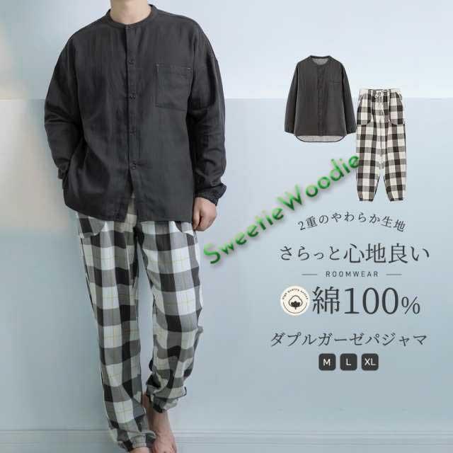 パジャマ 上下セット ダブルガーゼ ガーゼパジャマ メンズ 男 綿100% 長袖 秋 春 夏 冬 前開き ダブルガーゼ パジャマ ノーカラー