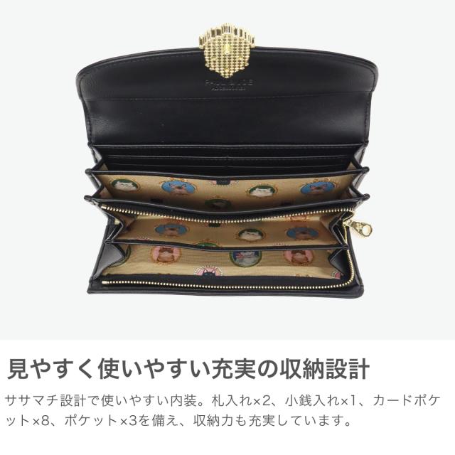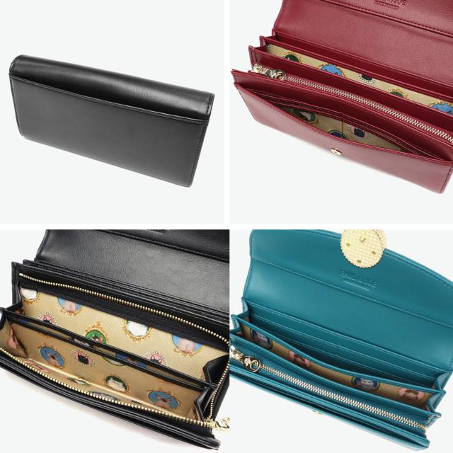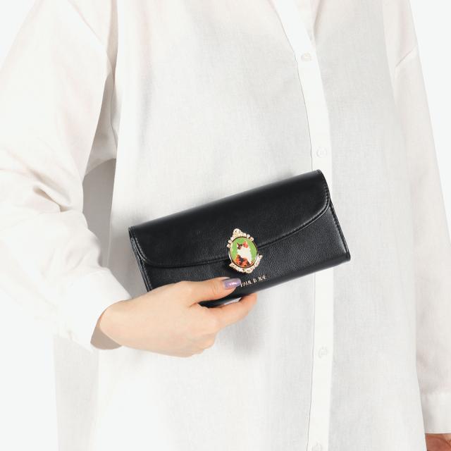 まるで絵画のような猫のブローチ風メタルが高級感を演出する、おしゃれな『CAT BROOCH』シリーズ。裏地も猫尽くしのデザインになっていて、猫好きさんにはたまりません♪使い勝手も抜群な、かぶせタイプの長財布です。