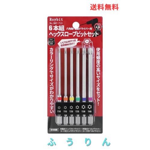 【商品仕様】セット内容:T10、T15、T20、T25、T30、T40(各1本)。入り数:6本組。軸径:6.35mm六角軸。全長:100mm。素材:クロムバナジウム鋼。
