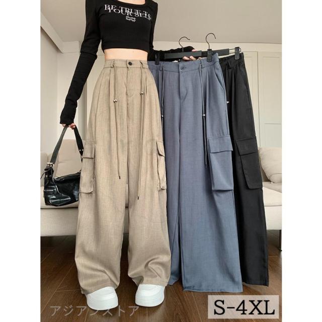 ワイドパンツ レディース 秋物 カーゴパンツ ストレートパンツ ウエストゴム 紐付き 無地 楽チン イージーパンツ タック入れ ボトムズ 長ズボン 春秋 春夏秋