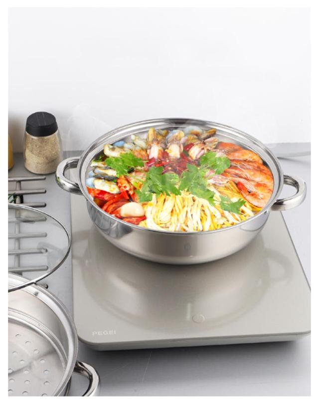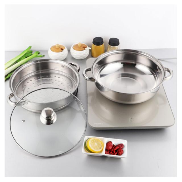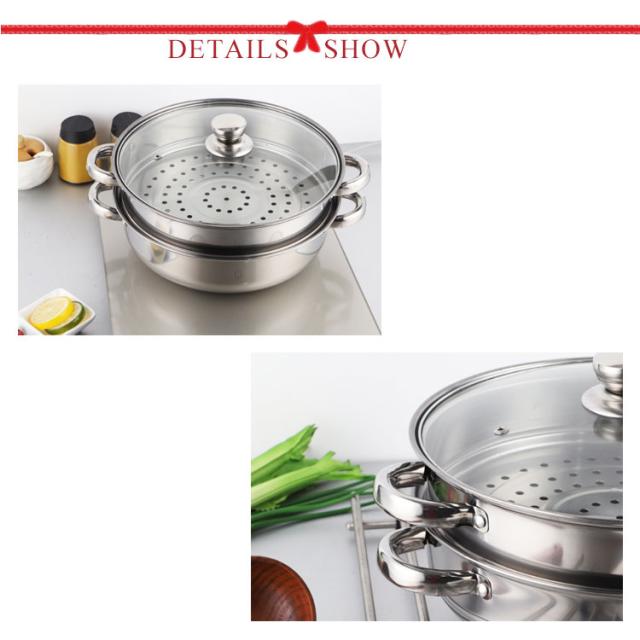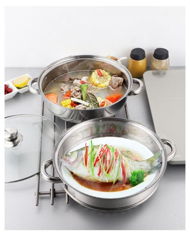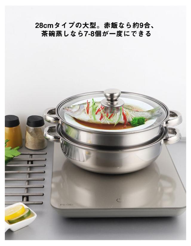 | 耐久性に優れたステンレス製の二段蒸し器です。 28cmタイプの大型。赤飯なら約9合、茶碗蒸しなら7-8個が一度にできる 下鍋は両手鍋としておでんやシチュー等の煮込み料理にもお使い頂けます。 ガスコンロでも、IHクッキングヒーターでも使えます。 調理中の鍋の中が見やすい全面耐熱ガラス蓋付き。蒸し用プレート2枚付属。 | |