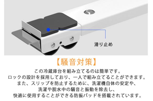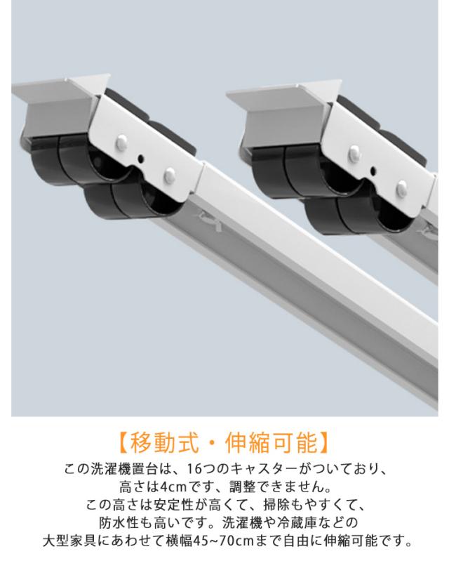 | 45?70cm対応!洗濯機伸縮式置き台2個セット。大型家具・大型家電の移動に! 【高品質素材】高品質なステンレス鋼を採用した洗濯機置き台は、非常に安定し、耐腐食性や錆止め性が抜群です。4連キャスターを搭載しており、300 kgの負荷に耐えられ、エアコン、ドラム式や全自動洗濯機、冷蔵庫、食器棚洗濯機、植木鉢、大型機器など、さまざまな家具に使用することができます。 【移動式・伸縮可能】この洗濯機置台は、16つのキャスターがついており、高さは4cmです、調整できません。この高さは安定性が高くて、掃除もやすくて、防水性も高いです。洗濯機や冷蔵庫などの大型家具にあわせて横幅45~70cmまで自由に伸縮可能です。また、洗濯機や冷蔵庫と床との接触を有効に防止できし、排水と清掃問題を簡単に解決します。水分による製品の錆びを防ぐこともでき、設備の寿命を延長することができます。 【騒音対策】この冷蔵庫台を組み立てるのは簡単です。ロックの設計を採用しており、一人で組み立てることができます。また、スリップを防止するために、洗濯機自体の安定や、洗濯や脱水中の騒音と振動を除去し、快適に使用することができる防振パッドを搭載されています。 【固定できるストッパー付】レバーを上下するワンタッチ式なので簡単に解除も固定もできます。 【簡単な長さ調整】お好みの長さに調整して、ネジで固定するだけの簡単セッティング。最大で70cmまで大きさに対応します。 | |