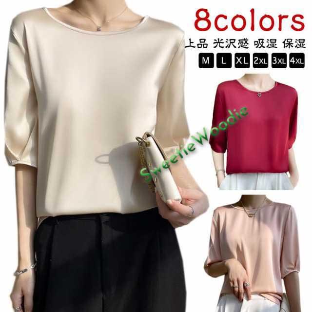 シルク 5分袖 シルクサテン レディース ブラウス 大きいサイズ 春 夏 半袖 シャツ クルーネック UVカット サテン シャツブラウス 上品 光沢感 吸湿 保湿 5分袖 大人 ツルツル 無地 シンプル