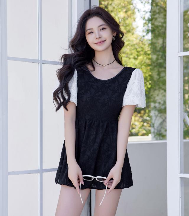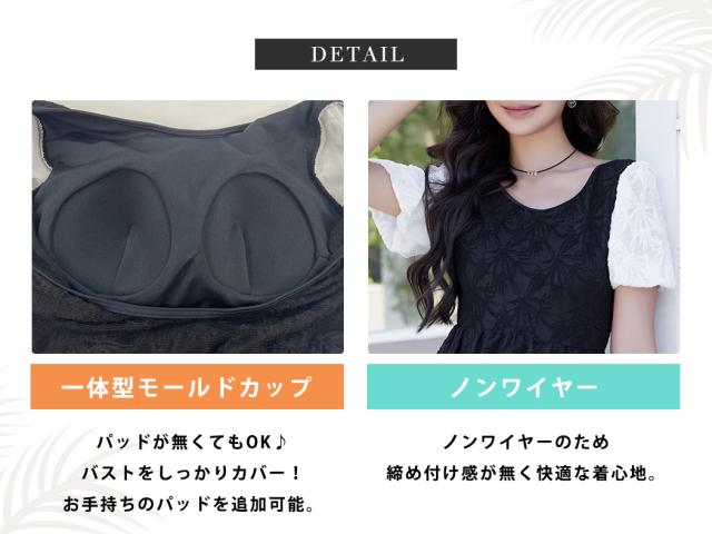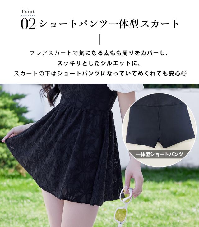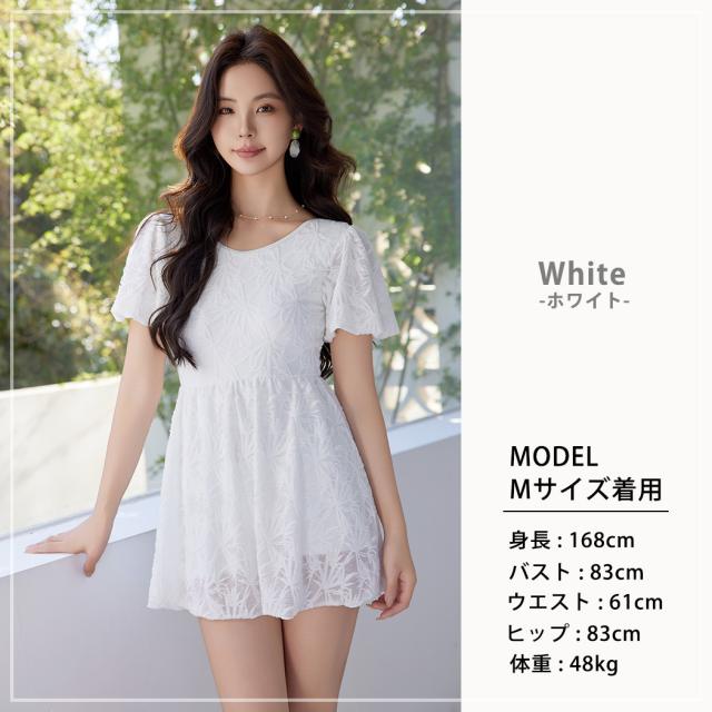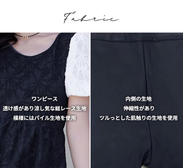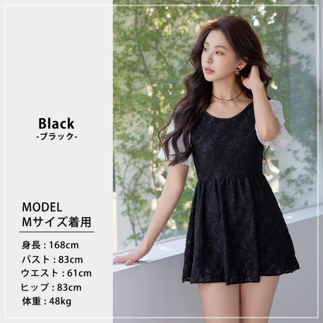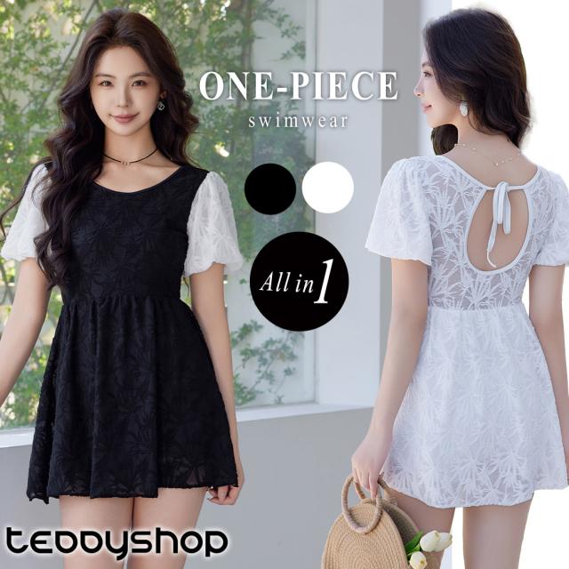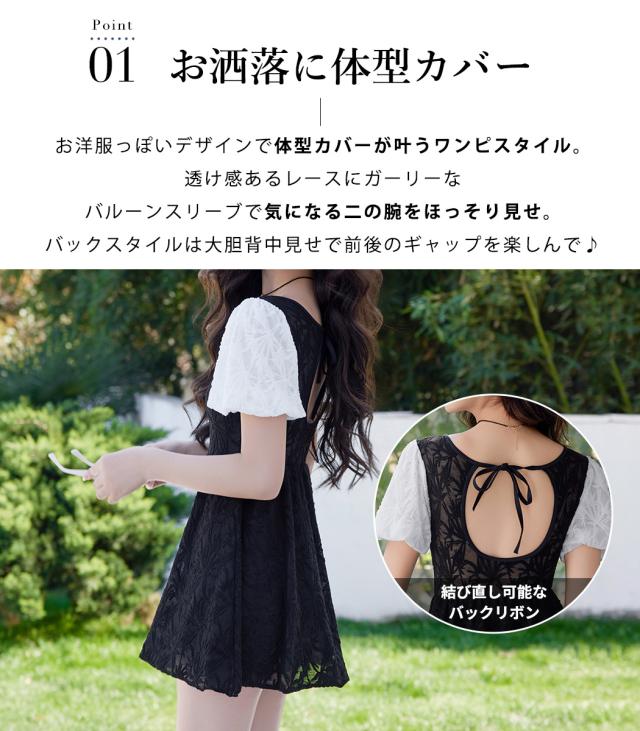 水着 ワンピース 体型カバー レディース オールインワン 半袖 パフスリーブ バルーンスリーブ バックリボン 透け感 一体型モールドカップ タウンユース ノンワイヤー バスト 盛れる 二の腕 ウエスト ヒップ 太もも カバーアップ 黒 白