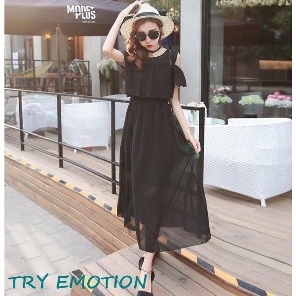 レディースワンピース夏可愛いオフショルダーロング丈シフォン半分袖涼しい無地肩見えキャミソール着痩せ女性婦人服