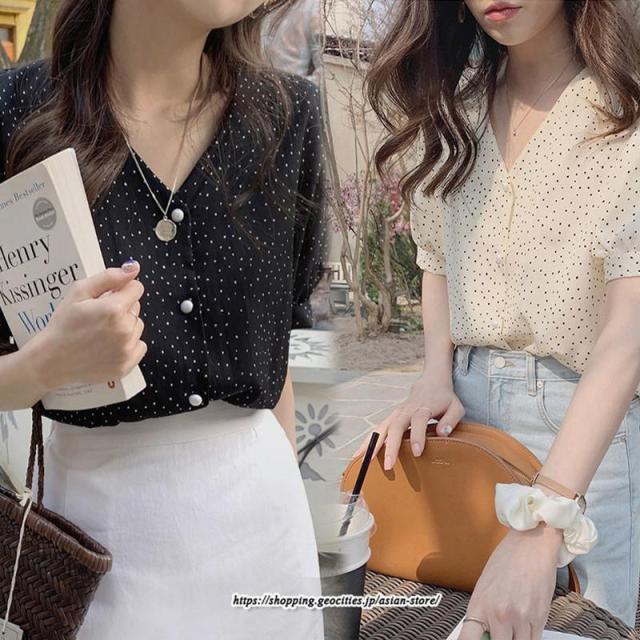 シャツ ブラウス Vネックドットブラウス シフォンドット柄ブラウス 半袖 夏新作 涼しい 柔らか オフィスカジュアル 韓国 きれいめ 上品 無地 ビジネス デート