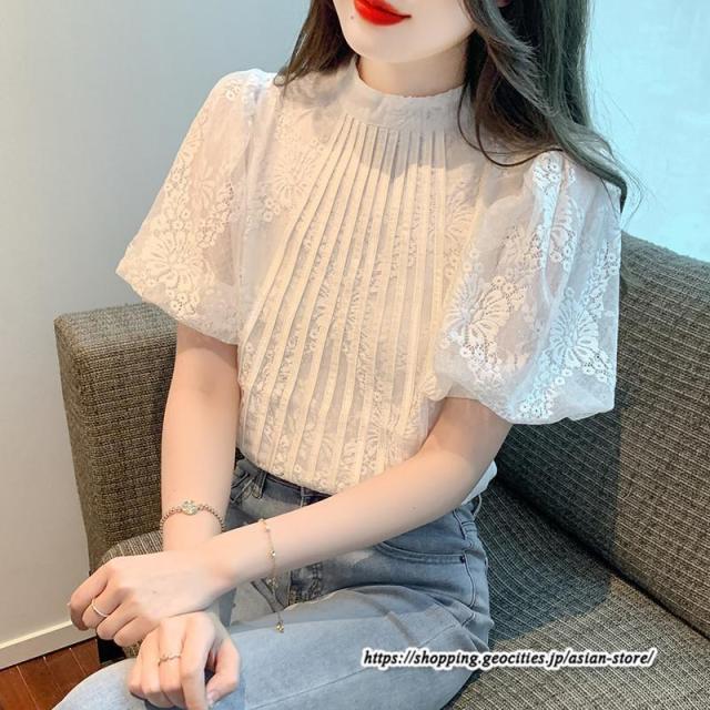 ブラウス パフスリーブ レディーストップス 半袖 シャツ レース 夏服 無地大人可愛い フォーマル エレガント ボリューム袖 お呼ばれ 二次会 通学通勤 40代 刺繍