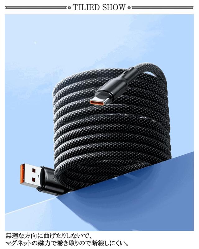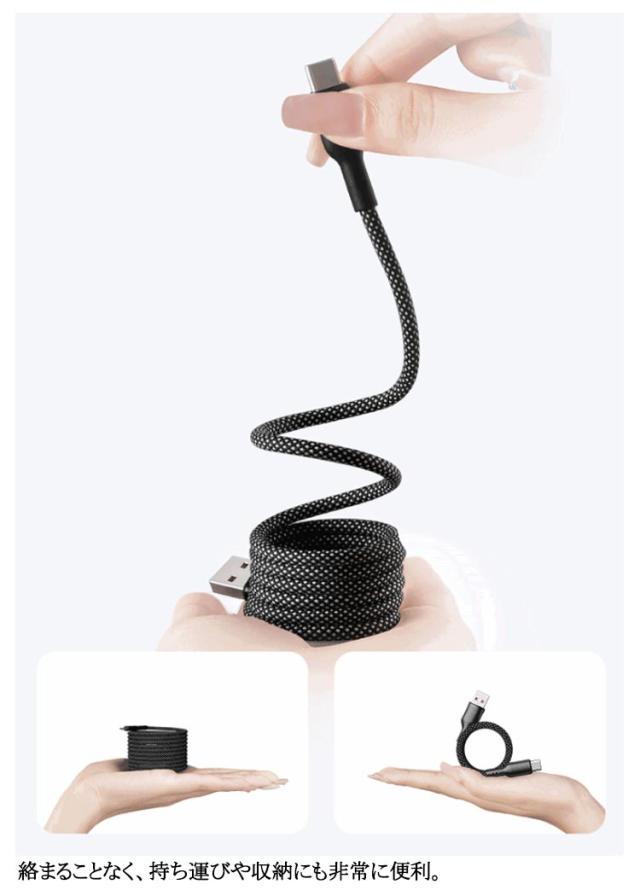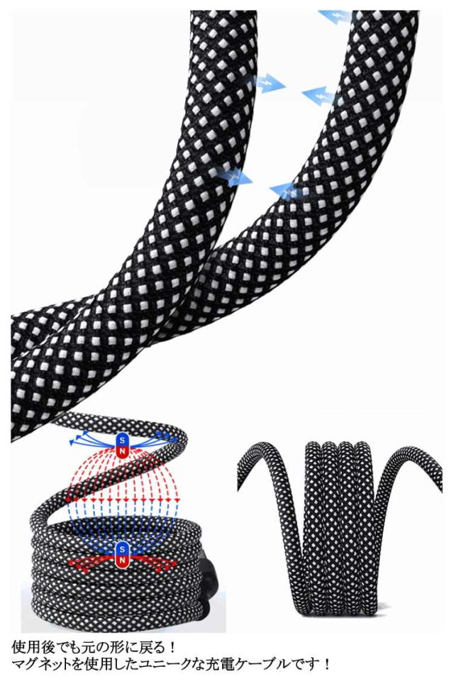 | 1/1.5/2m選べる! 磁気付きでケーブルをキレイにまとめて収納ができる!常に渦巻形状を保つマグネット式ケーブルです。 無理な方向に曲げたりしないで、マグネットの磁力で巻き取りので断線しにくい。 必要な長さだけ伸ばして使えてごちゃごちゃしない!デスク周りもバッグの中も車内もすっきり片付きます! 電力供給・データ転送が可能でいつでもどこでも、充電がもっと便利に楽しくなります! 絡まることなく、持ち運びや収納にも非常に便利。 使用後でも元の形に戻る!マグネットを使用したユニークな充電ケーブルです! | |