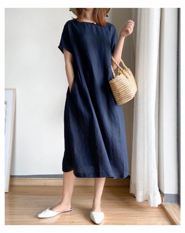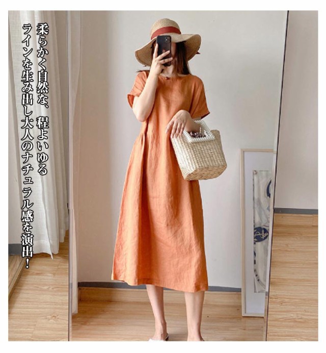 ポケット付き Aライン 夏 綿麻 春 ワンピース ロングワンピース ロング 半袖 綿麻ワンピ ミモレ丈 可愛い 涼しい プリーツギャザー 大人 着痩せ 体型カバー エレガント 大人可愛い 綿麻混 通勤