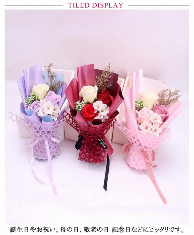 | 大切な方への贈り物に!ソープフラワーとは花びら一枚一枚がせっけん素材で作られているお花で、鮮やかなカラーやほのかな香りが楽しめる、あたらしいタイプの造花です。 誕生日やお祝い、母の日、敬老の日 記念日などにピッタリです。 様々なシーンの贈りものに!香りも楽しめるソープフラワーは、美しいまま長く楽しめるので 様々なシーンで喜ばれる贈り物になってくれるはずです。 癒やされるソープフラワーブーケ。結婚のお祝いや記念日の贈り物、出産祝いなど、お誕生日プレゼントにはもちろん、入学祝いや卒業祝い、送別の贈り物にも! | |