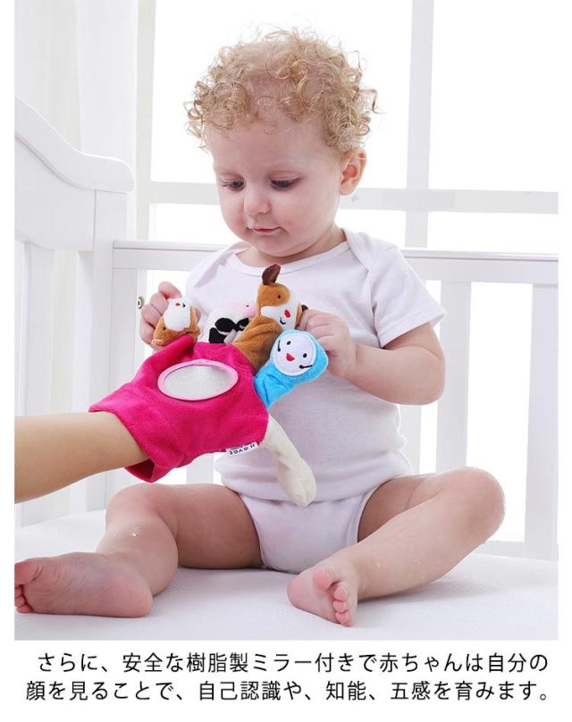| ミラー付き布製指人形。 指人形と遊びながら子供の想像力を育成。 さらに、安全な樹脂製ミラー付きで赤ちゃんは自分の顔を見ることで、自己認識や、知能、五感を育みます。 | |