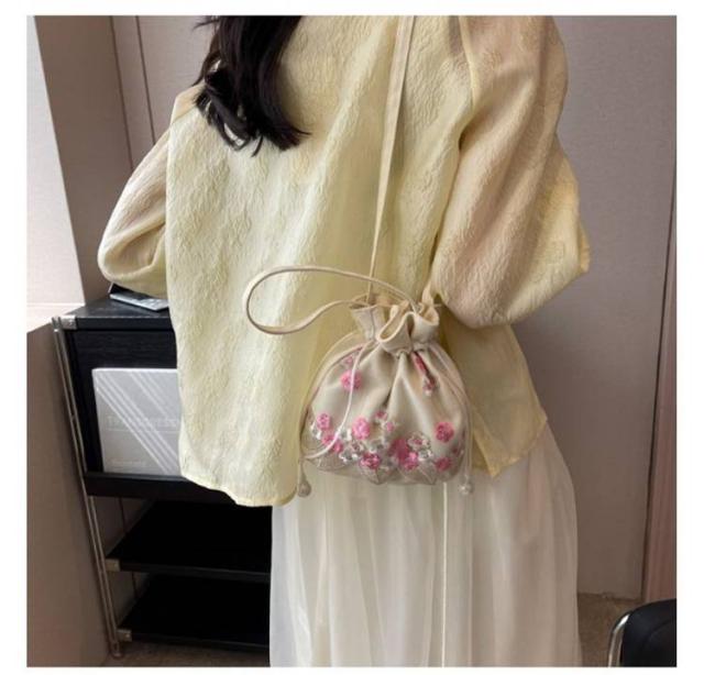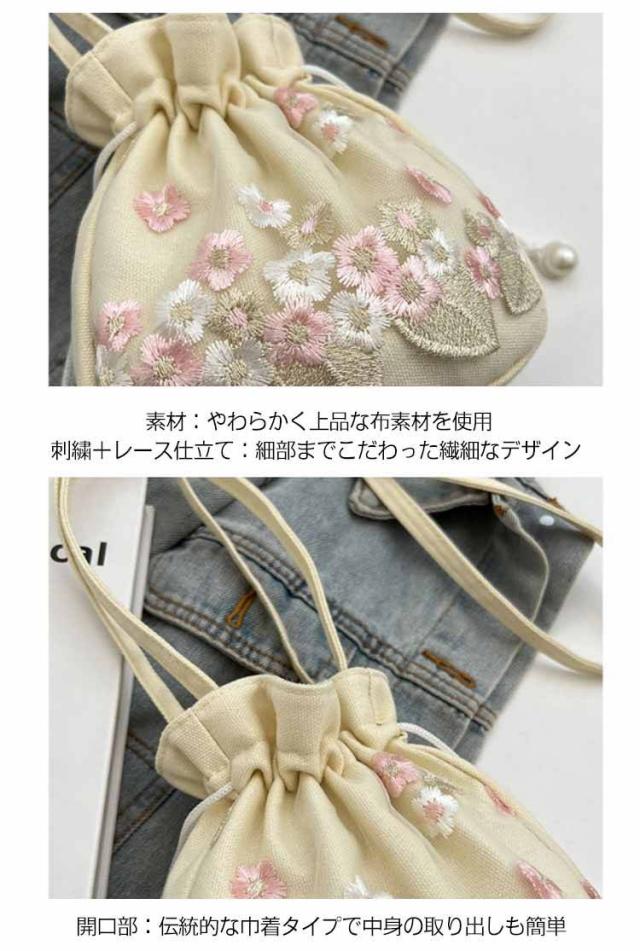 巾着バッグ ショルダー 布製 レース刺繍 ミニバッグ ポシェット おしゃれ かわいい 手提げ 斜めがけ ショルダーバッグ 和装バッグ チャイナ風 漢服 着物 振袖 浴衣用 花火大会 お祭り 卒業式 成人式