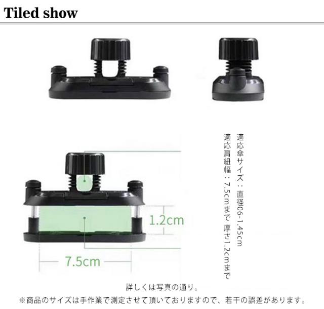 | サイズについての説明 | 詳しくは写真の通り。 適応傘サイズ:直径06-1.45cm 適応肩紐幅:7.5cmまで 厚さ1.2cmまで ※商品のサイズは手作業で測定させて頂いておりますので、若干の誤差があります。 |
