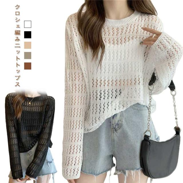 長袖 ニットトップス 透かし編み かぎ レディースファッション 人気 ホワイト ブラック ベージュ カーキ キャラメル