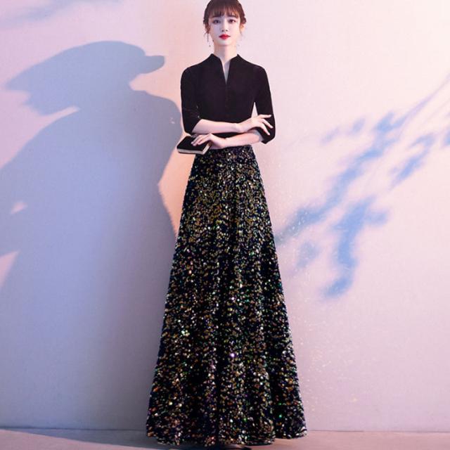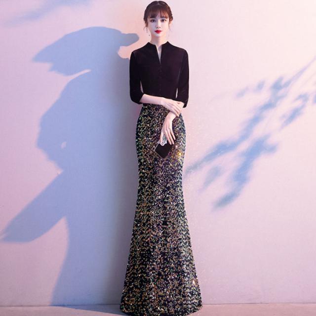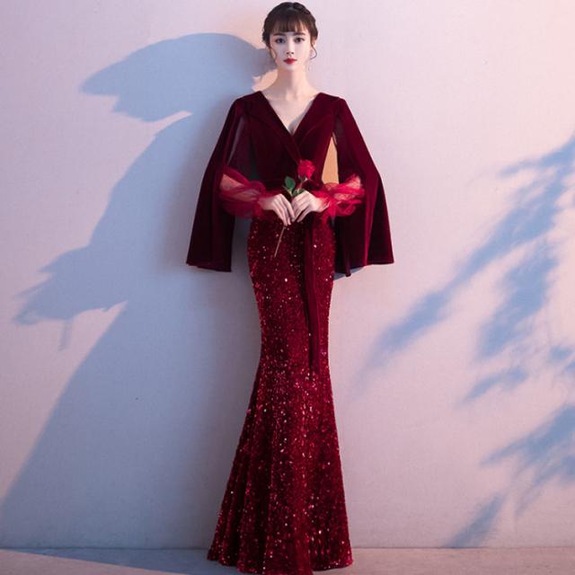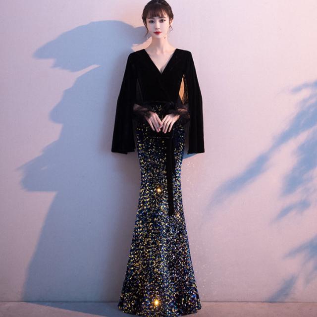 タイトドレス メッシュ袖 ワンピース Vネック マーメイドドレス イブニングドレス ウェディングドレス ロングドレス フォーマル セクシー スパンコール キラキラドレス ナイトドレス パーティードレス