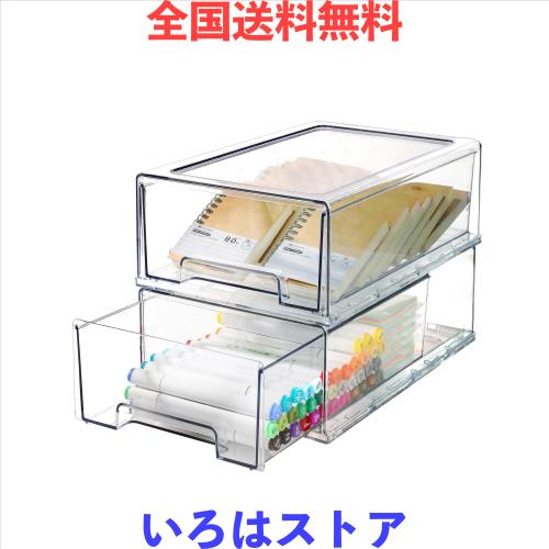2個セット重なるクリアケース 幅32×奥行21×高さ11cm、冷蔵庫収納、引き出し 卓上収納ケース、書類ケース、化粧品、事務用品、文書収納